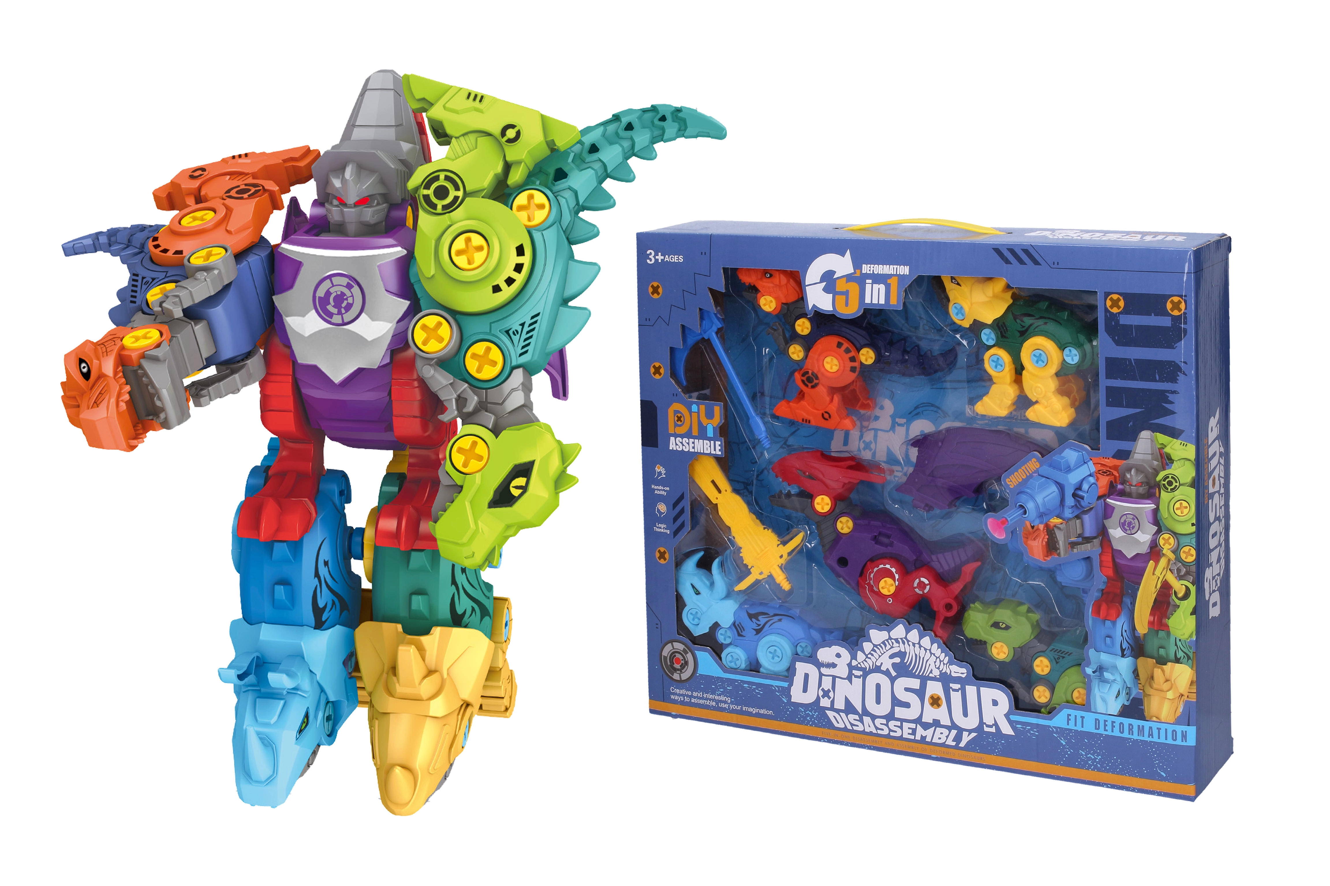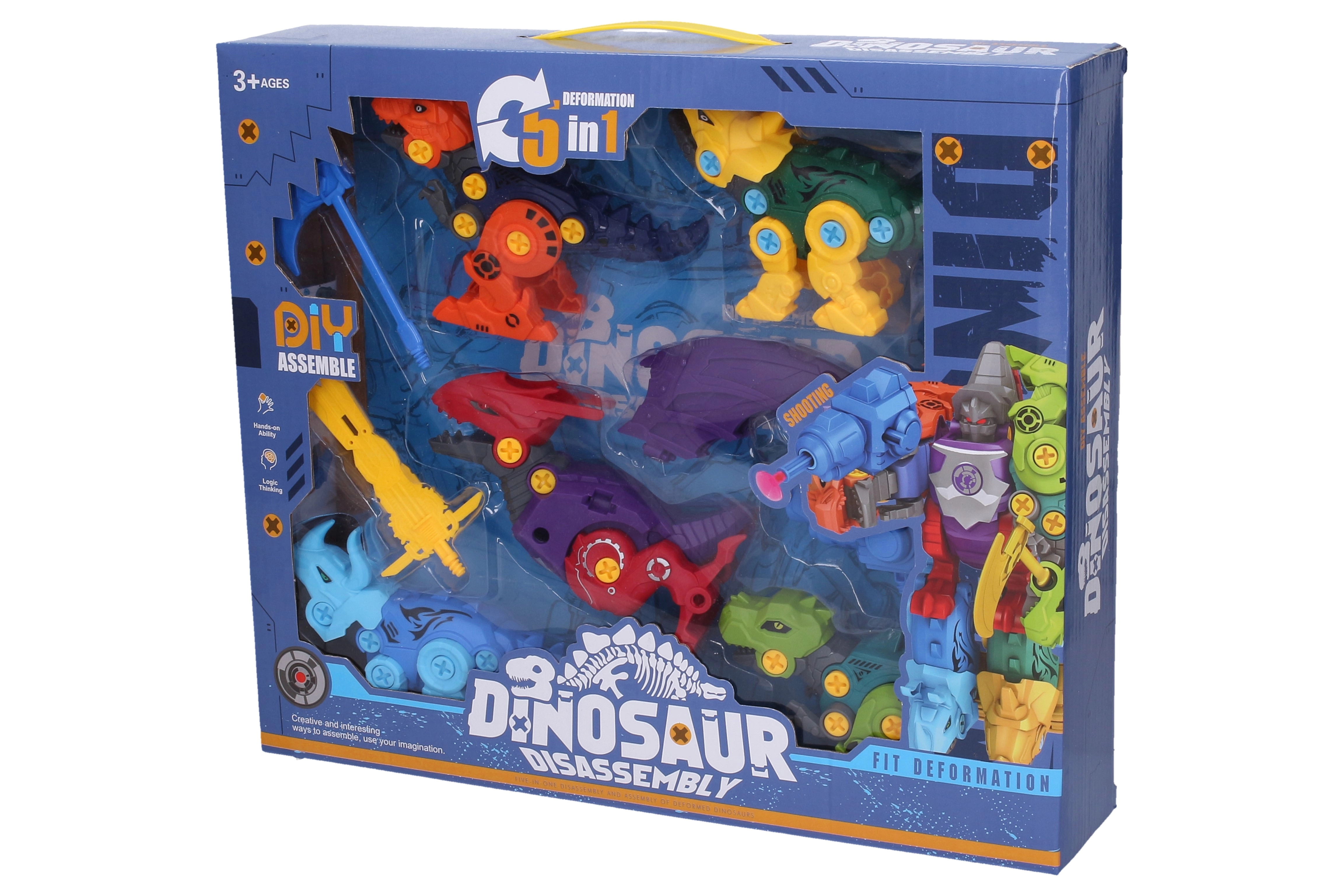 Το σετ βιδωτών δεινοσαύρων 5-σε-1 προσφέρει στα παιδιά ώρες δημιουργικής απασχόλησης. Κάθε ένας από τους πέντε δεινοσαύρους μπορεί να συναρμολογηθεί ξεχωριστά με απλά βιδωτά μέρη και στη συνέχεια όλοι να ενωθούν σε ένα μεταμορφούμενο ρομπότ με εκτοξευόμενο όπλο. Το παιχνίδι καλλιεργεί την υπομονή, τη συγκέντρωση και την ανάπτυξη της τεχνικής σκέψης.
