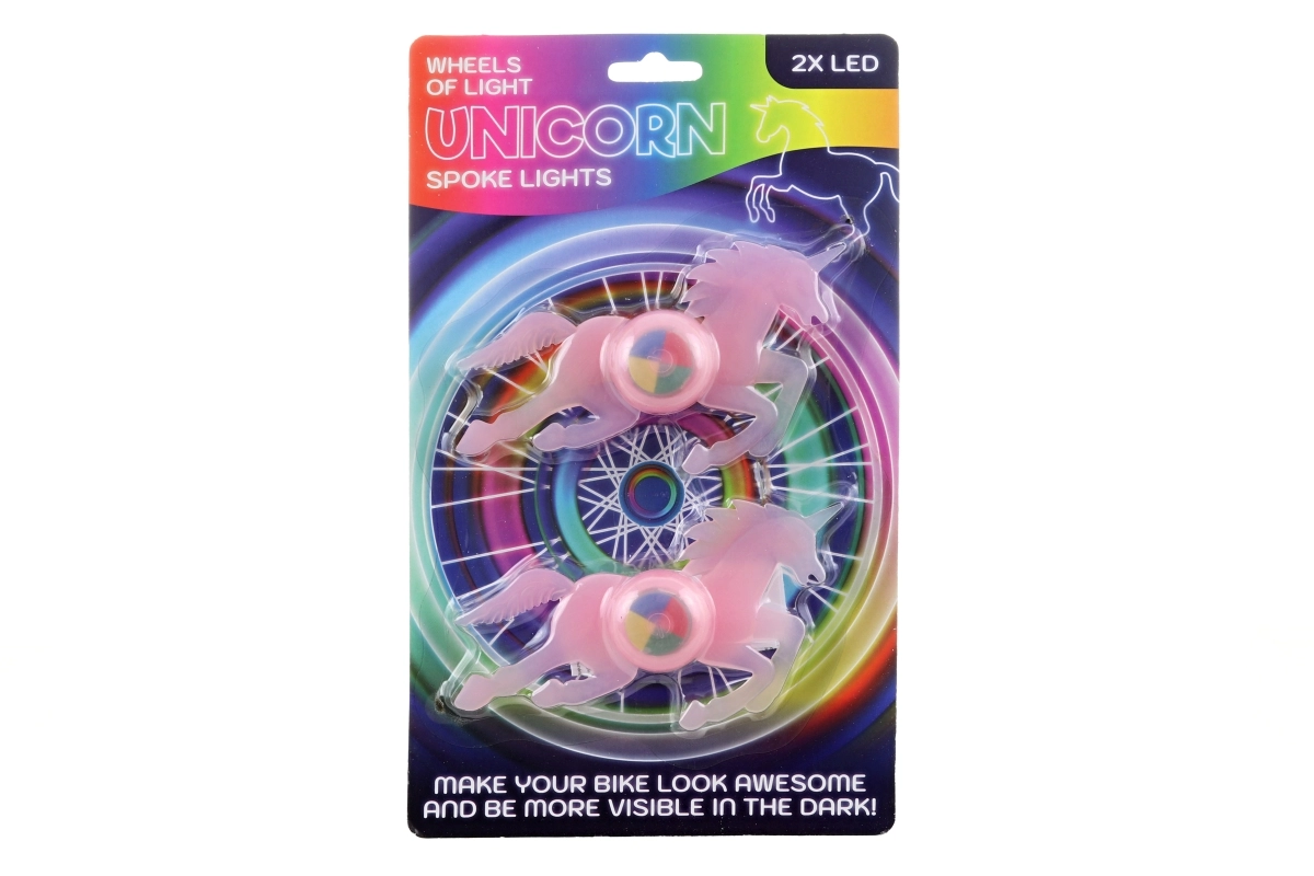 Αυξήστε την ορατότητά σας και προσθέστε λίγη μαγεία στη διαδρομή σας με ποδήλατο χάρη σε αυτά τα στιλάτα LED φωτάκια ποδηλάτου με σχέδιο μονόκερων. Η συσκευασία περιλαμβάνει δύο φωτεινά στοιχεία που προσαρμόζονται εύκολα στις ακτίνες του ποδηλάτου σας.