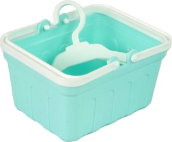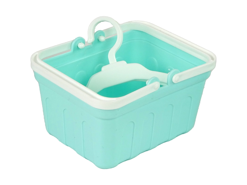 Το πρακτικό καλάθι με χερούλι διευκολύνει τη μεταφορά των ρούχων και οι δύο κρεμάστρες βοηθούν στη διατήρηση της τάξης – ιδανικό συμπλήρωμα για ρεαλιστικό παιχνίδι.