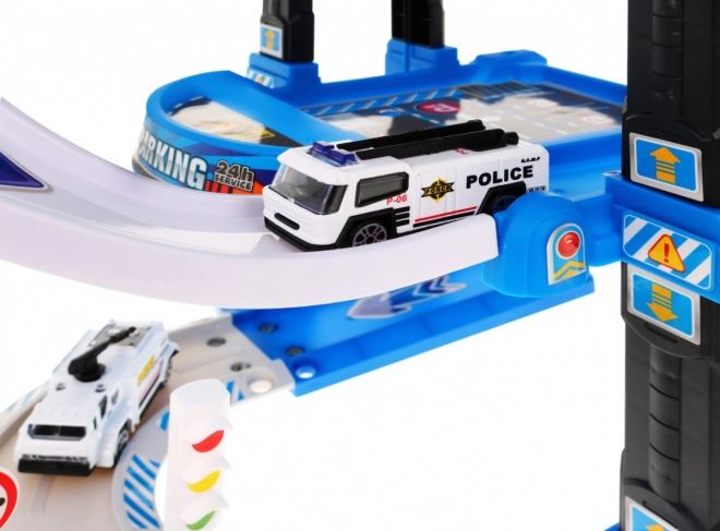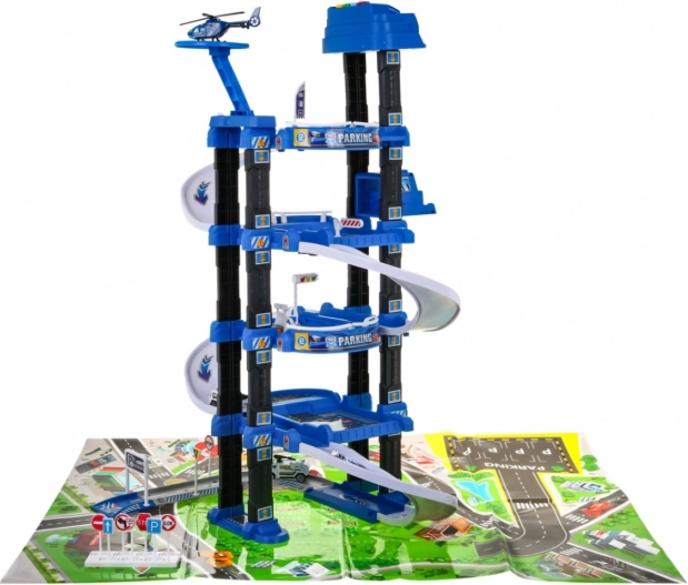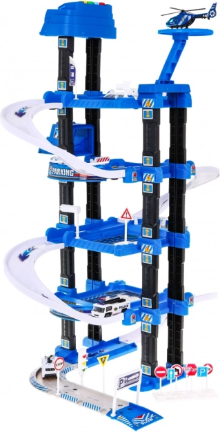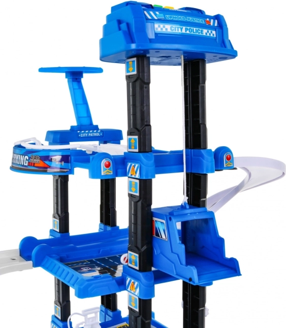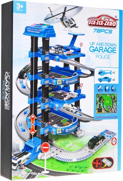 Αυτό το στιβαρό, πολυώροφο αστυνομικό πάρκινγκ συνδυάζει διασκεδαστική κίνηση στις ράμπες με λειτουργικό ασανσέρ, το οποίο κινείται πάνω-κάτω και συνοδεύεται από αναβοσβήνοντα φώτα και ηχητικά εφέ (τροφοδοσία 3× AA, δεν περιλαμβάνονται). Στο επάνω επίπεδο θα βρείτε ελικοδρόμιο, ενώ τα χαμηλότερα επίπεδα προσφέρουν θέσεις στάθμευσης και διελεύσεις.