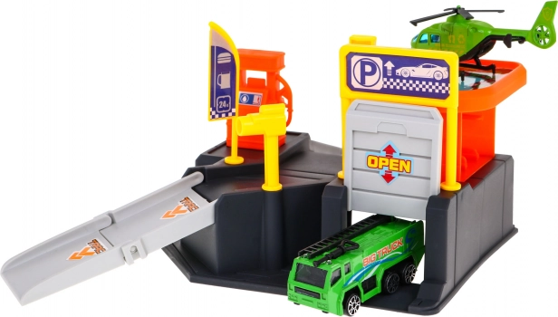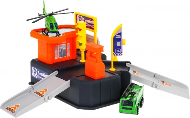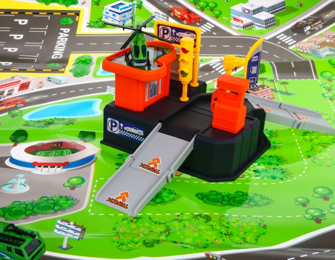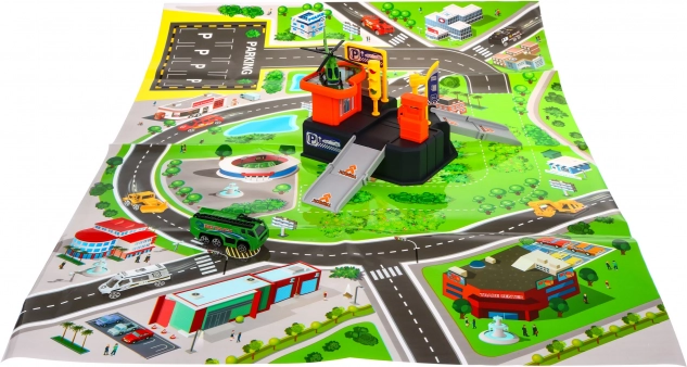 Αυτό το πολύχρωμο πλαστικό σετ μετατρέπει το δωμάτιο σε ένα μικρό κυκλοφοριακό κέντρο. Το διώροφο πάρκινγκ με ράμπες και ελικοδρόμιο συμπληρώνεται από το ευανάγνωστο χαλάκι με πόλη και δρόμους, πάνω στο οποίο τα παιδιά μπορούν να κινούν το αυτοκινητάκι και να προσγειώνουν το ελικόπτερο. Χάρη στις συμπαγείς διαστάσεις του χωρά εύκολα στο παιδικό δωμάτιο και τακτοποιείται γρήγορα.