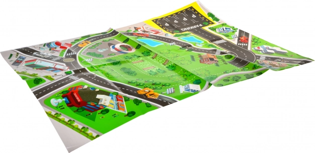 Χαλάκι διαστάσεων περ. 78 × 58 cm που απεικονίζει δρόμους, πάρκινγκ και κτίρια – ιδανικό για την εκμάθηση βασικών κυκλοφοριακών καταστάσεων.