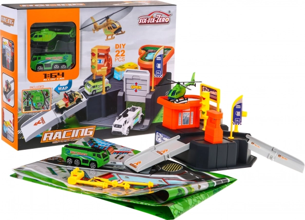 Περιλαμβάνονται αυτοκινητάκι, ελικόπτερο, σήμανση και αυτοκόλλητα. Το σετ των 22 κομματιών είναι έτοιμο για δράση αμέσως μόλις ανοιχτεί.