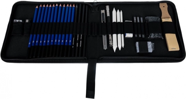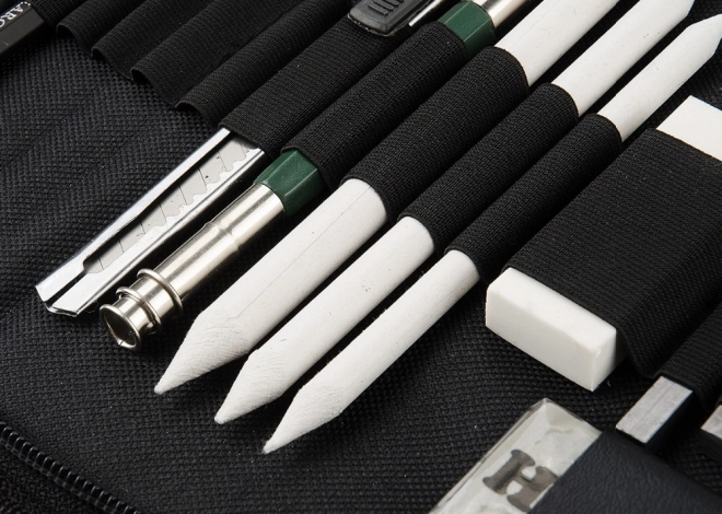 Περιλαμβάνονται επίσης μπλέντερ (χάρτινα τορτιγιόν) σε τρεις διαμέτρους, μαχαίρι βιβλιοδεσίας, διπλή και κλασική ξύστρα, πλάσινη (πλαστελίνη) γόμα καθώς και κλασική γόμα, και σετ γυαλόχαρτων για τέλειο διαμόρφωμα της μύτης. Το σετ είναι εξαιρετικό για πορτρέτο, τεχνικό σχέδιο και καλλιτεχνικά σκίτσα.