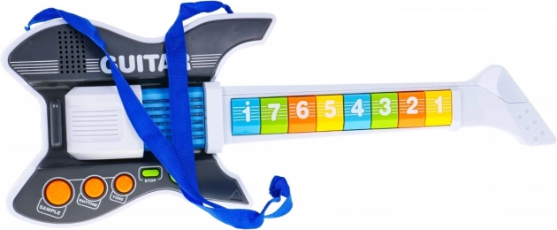 Στο σώμα της κιθάρας θα βρείτε το κουμπί On/Off, τη λειτουργία Stop για άμεση παύση της μουσικής, την επιλογή Sample με 8 demo κομμάτια, τη λειτουργία Rhythm με 8 κιθαριστικούς ρυθμούς και τον διακόπτη Tone με 3 ηχόχρωματα κιθάρας. Τα αριθμητικά πλήκτρα επιτρέπουν εύκολη αναπαραγωγή και κατά το παίξιμο ανάβουν πολύχρωμα LED φωτάκια. Περιλαμβάνεται ιμάντας ώμου για άνετη μεταφορά.