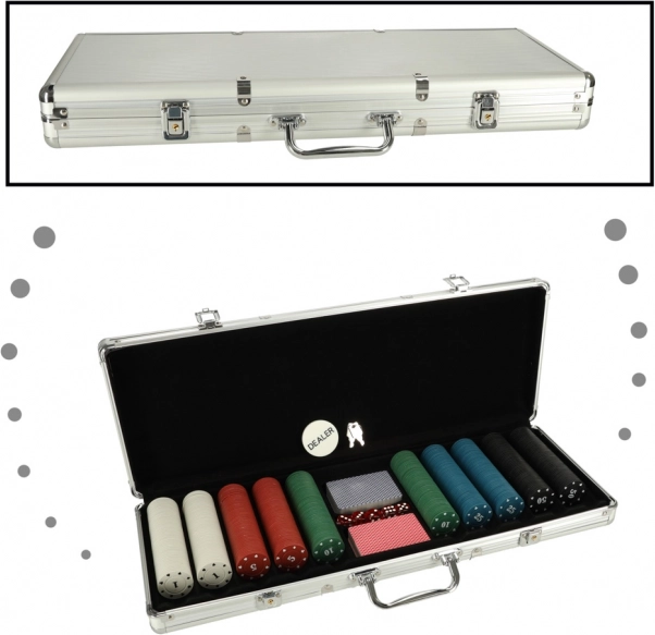 Το σετ περιλαμβάνει μάρκες, τράπουλες και ζάρια για διάφορες παραλλαγές παιχνιδιών. Το ασημί βαλιτσάκι εξασφαλίζει ασφαλή αποθήκευση των εξαρτημάτων και εύκολη μεταφορά.