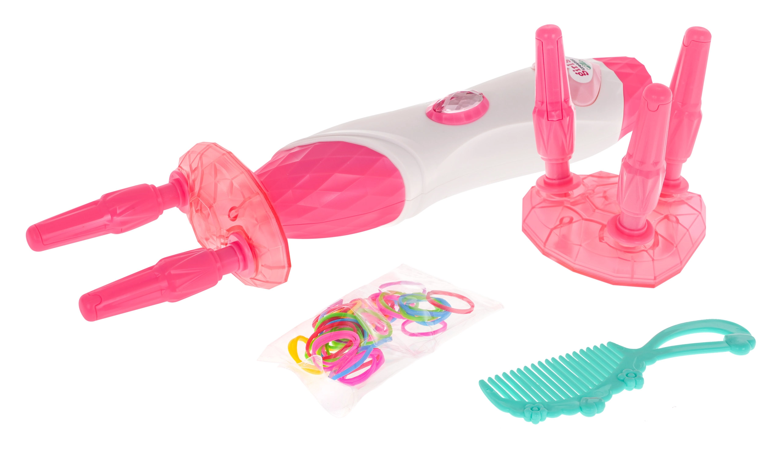 Το σετ για πλέξιμο κοτσιδιών έχει δημιουργηθεί για απλές και διασκεδαστικές περιποιήσεις μαλλιών. Αυτό το χαρούμενο σετ περιλαμβάνει πλαστική μηχανή πλεξίματος με εναλλάξιμα εξαρτήματα, χτένα και 50 λαστιχάκια μαλλιών. Αρκεί να τοποθετήσετε 2 έως 3 τουφάκια στους υποδοχείς και με το πάτημα του κουμπιού να δημιουργήσετε πανέμορφα κοτσιδάκια!