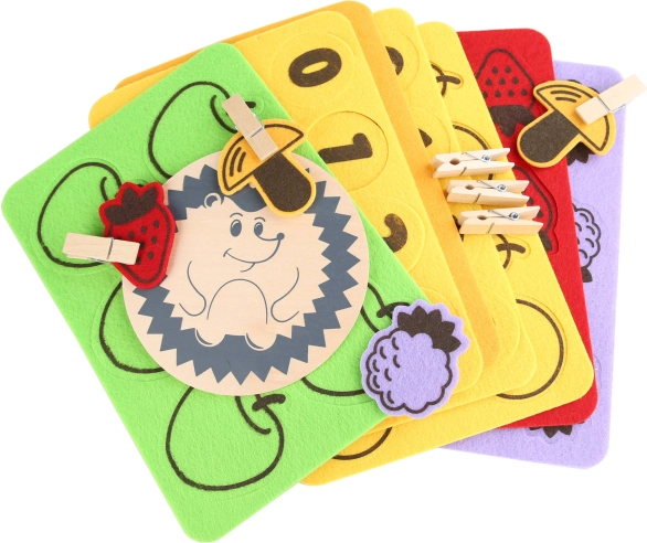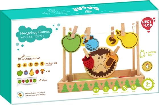 Το σετ περιλαμβάνει ξύλινη βάση, σκαντζοχοιράκι, διασκεδαστικές κάρτες και πολύχρωμα τσοχένια υποστρώματα - ιδανικό και για ομαδικό παιχνίδι με περισσότερα παιδιά. Για εύκολη αποθήκευση, όλα είναι συσκευασμένα σε πρακτικό βαμβακερό πουγκί.