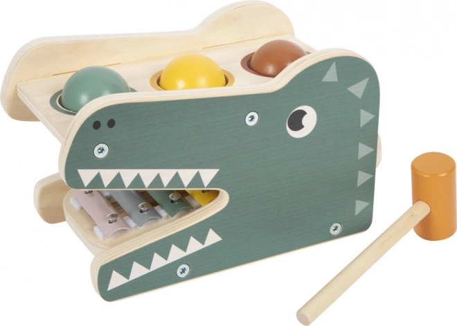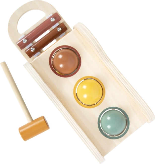 Αυτό το ξύλινο παιχνίδι συνδυάζει πολυλειτουργικό παιχνίδι με όμορφο σχεδιασμό. Τα παιδιά χτυπούν με το σφυράκι τις τρεις χρωματιστές μπάλες μέσα από την οπή και, καθώς κυλούν, ενεργοποιούν τους τόνους του ενσωματωμένου ξυλόφωνου. Το μουσικό μέρος αφαιρείται εύκολα και χρησιμοποιείται ξεχωριστά – ιδανικό για τα πρώτα μουσικά βήματα.