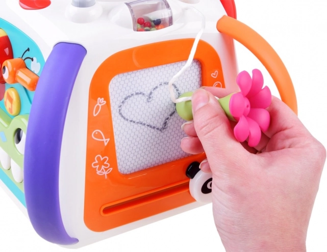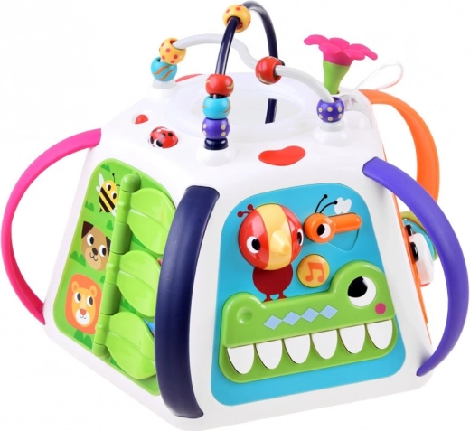 Με την ενεργοποίηση, ο κύβος παίζει μελωδίες, ηχητικά εφέ και φωτεινά στοιχεία, που παρακινούν τα παιδιά για περισσότερη εξερεύνηση. Περιλαμβάνει μικρό πιανάκι σε μορφή δοντιών κροκόδειλου, κινούμενα στοιχεία, συρόμενα πάνελ με οπτικό εφέ “ζωντανής” κίνησης και ασφαλές καθρεφτάκι.