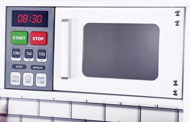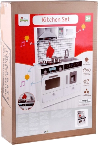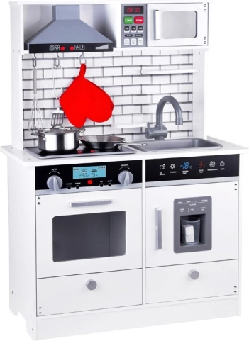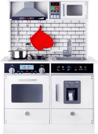 Αυτή η όμορφη ξύλινη κουζίνα είναι εξοπλισμένη με όλες τις απαραίτητες συσκευές που επιτρέπουν στα παιδιά να «μαγειρεύουν» τα πιο νόστιμα πιάτα. Η λευκή απόχρωση με μοντέρνα πλακίδια ταιριάζει ιδανικά σε κάθε παιδικό δωμάτιο ή γωνιά κουζίνας.