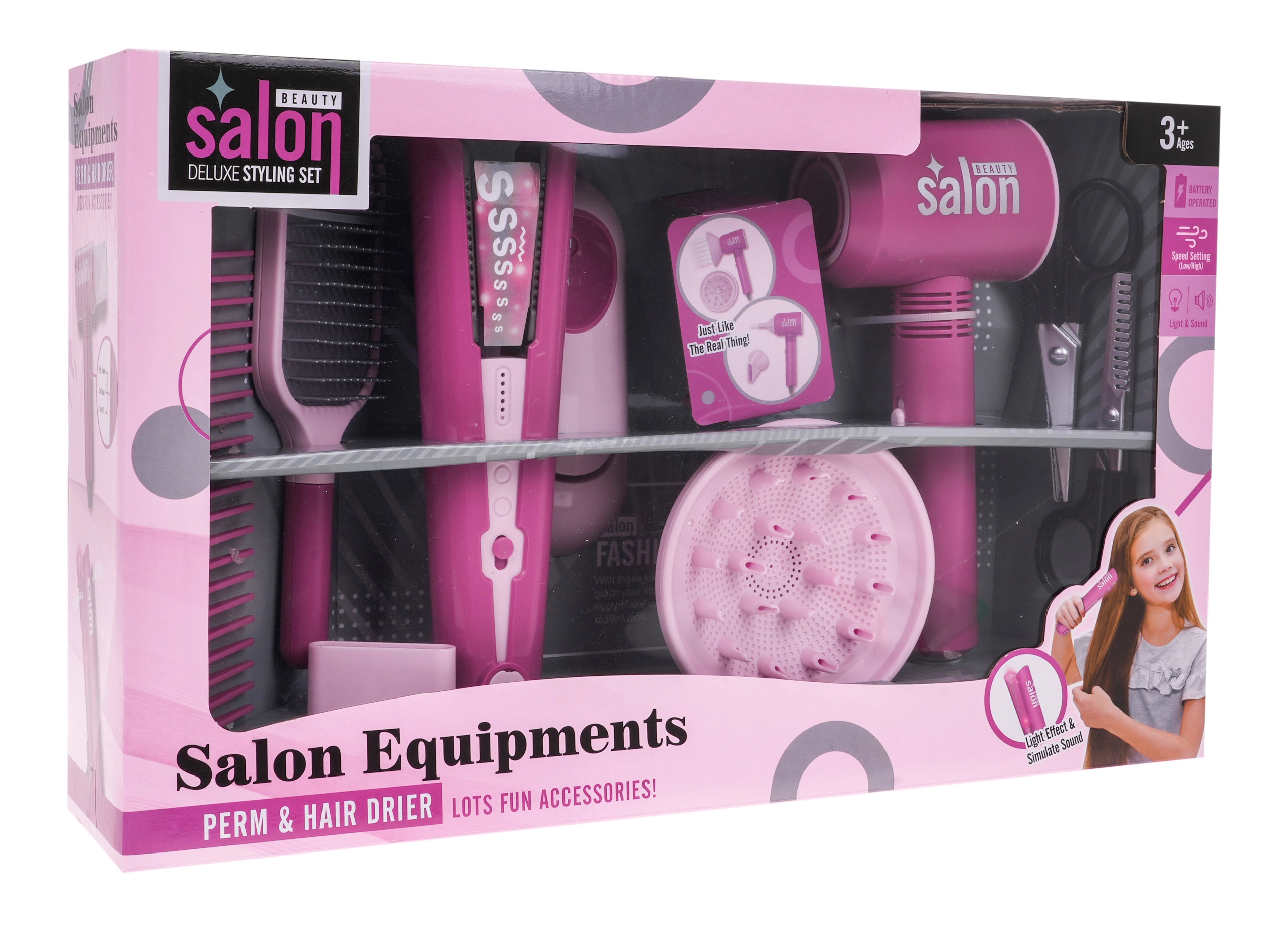 Ανακαλύψτε το διασκεδαστικό παιδικό σετ κομμωτικής για μικρούς στιλίστες από 3 ετών. Περιλαμβάνει λειτουργικό σεσουάρ με μπαταρίες με εναλλάξιμα εξαρτήματα και ισιωτική μαλλιών με φως και ήχο. Το σετ προσφέρει πλούσια αξεσουάρ, όπως ψαλίδι, χτένα, βούρτσα και βάση. Το σεσουάρ φυσάει αέρα, έχει 2 βαθμίδες ισχύος και παράγει ρεαλιστικούς ήχους στεγνώματος. Η ισιωτική με φωτεινά εφέ και ήχους χαρίζει στο παιχνίδι κομμωτηρίου ακόμη μεγαλύτερη αυθεντικότητα.