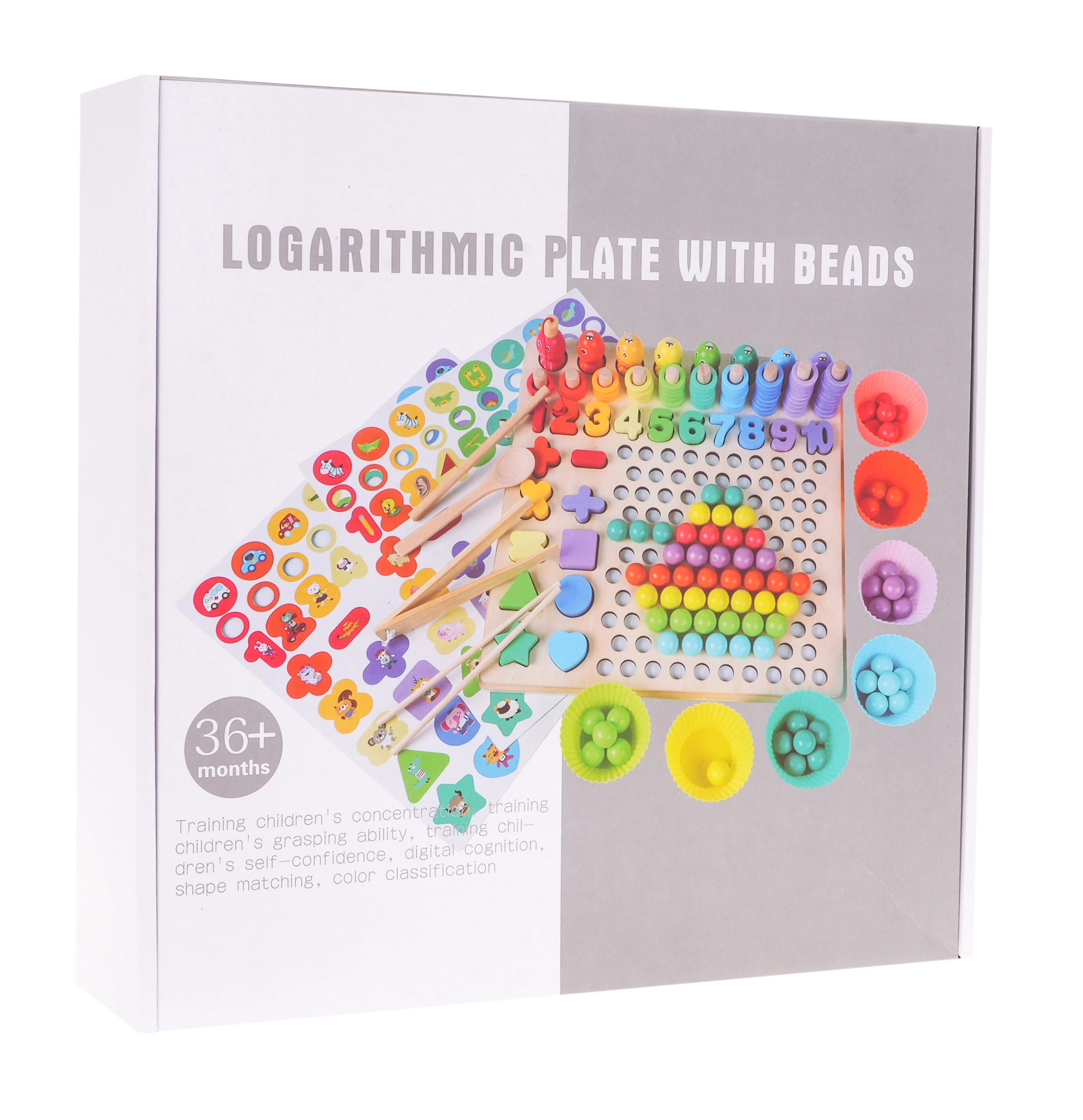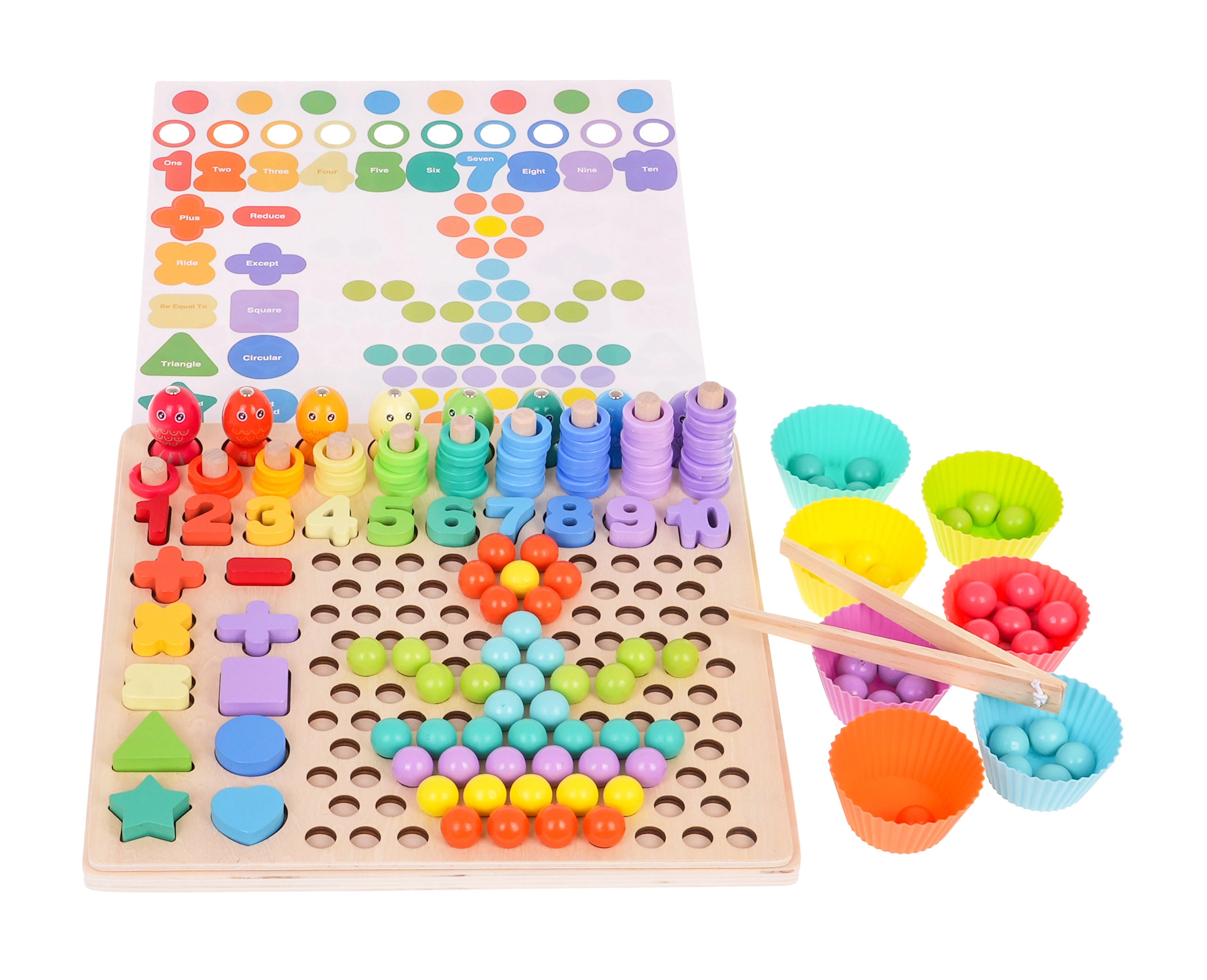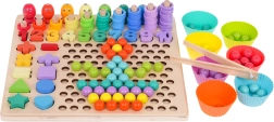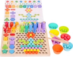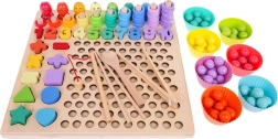 Χάρη στα διπλής όψης πρότυπα, τα παιδιά μπορούν να δημιουργούν σχέδια με μπίλιες και δαχτυλίδια, να εξασκούν την ταξινόμηση και τη σύγκριση και ταυτόχρονα να εδραιώνουν φυσικά τα θεμέλια της μέτρησης. Η ποιοτική ξύλινη βάση είναι ανθεκτική και ασφαλής, κατάλληλη για μάθηση στο σπίτι και για νηπιαγωγεία.