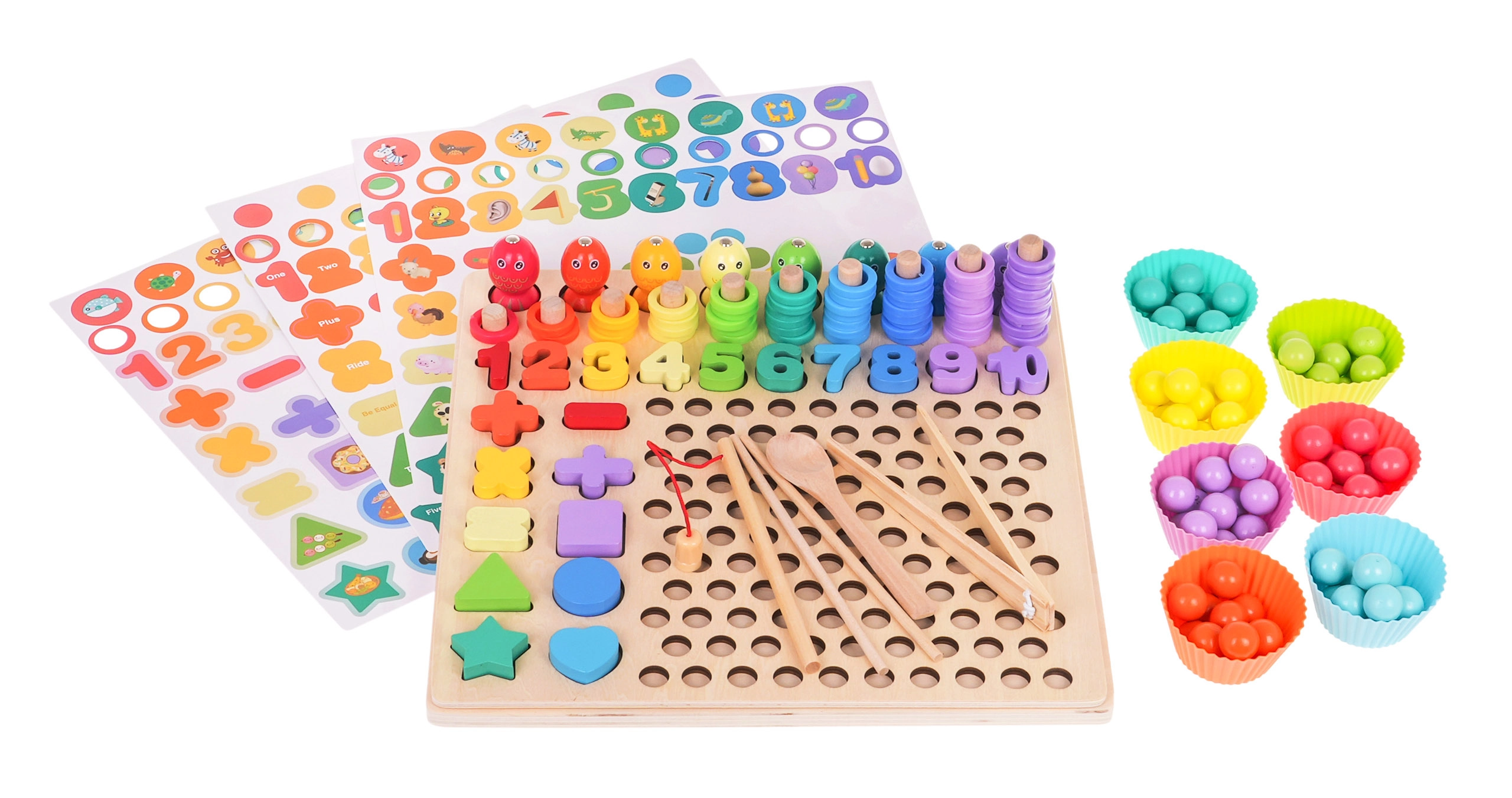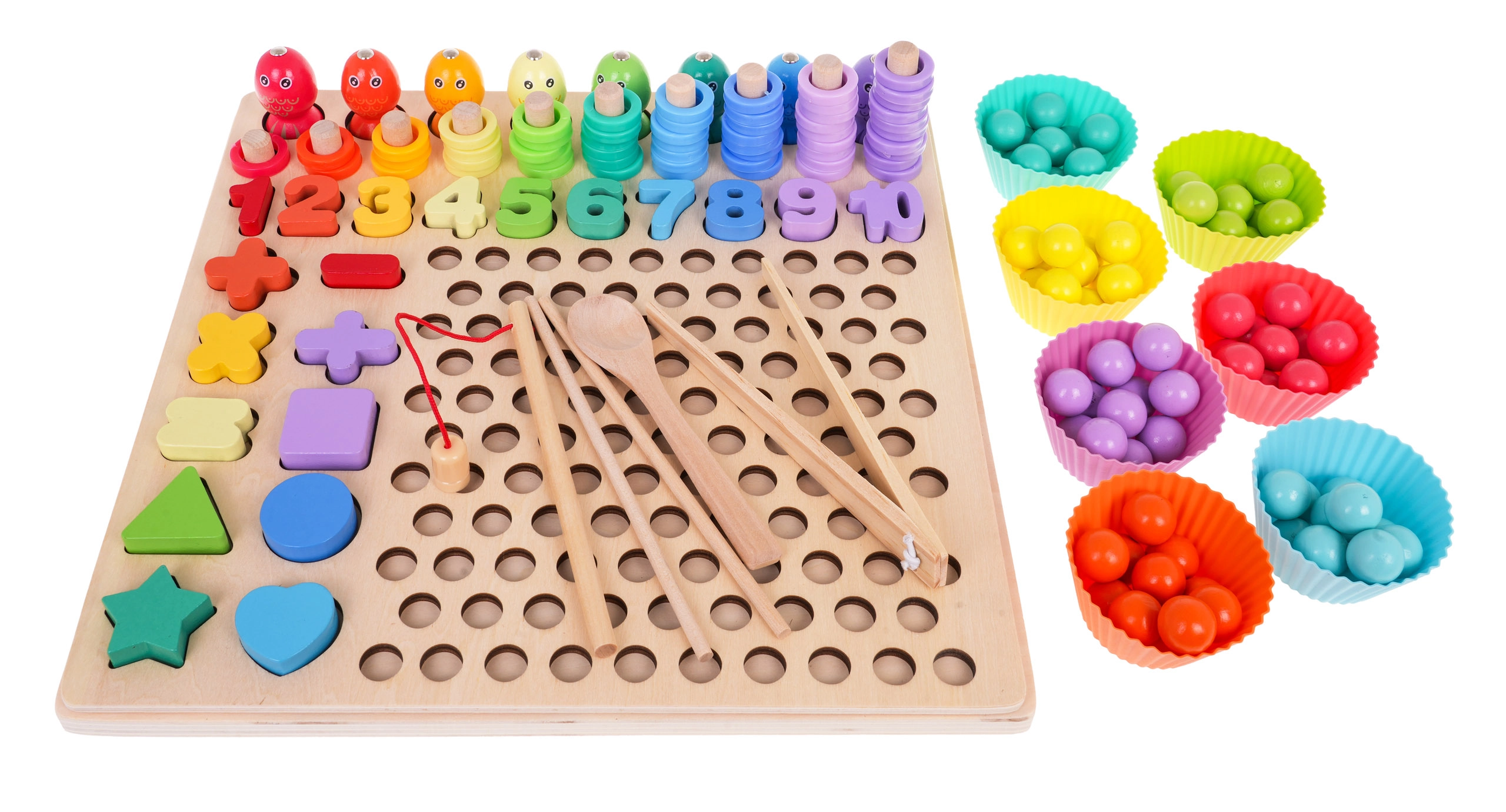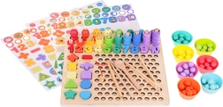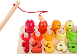 Αυτό το πολύχρωμο ξύλινο εκπαιδευτικό σετ προσφέρει στα παιδιά δεκάδες επιλογές παιχνιδιού: ψάρεμα με μαγνητικό καλάμι, περασμά και μέτρημα δαχτυλιδιών στους πασαλάκια, αντιστοίχιση αριθμών 1–10, δημιουργία απλών εξισώσεων καθώς και αναγνώριση σχημάτων και χρωμάτων. Τα σιλικονούχα κυπελλάκια και οι ξύλινες χάντρες με τσιμπιδάκι, κουταλάκι και ραβδάκια αναπτύσσουν ιδανικά τη λαβή και την ακρίβεια.