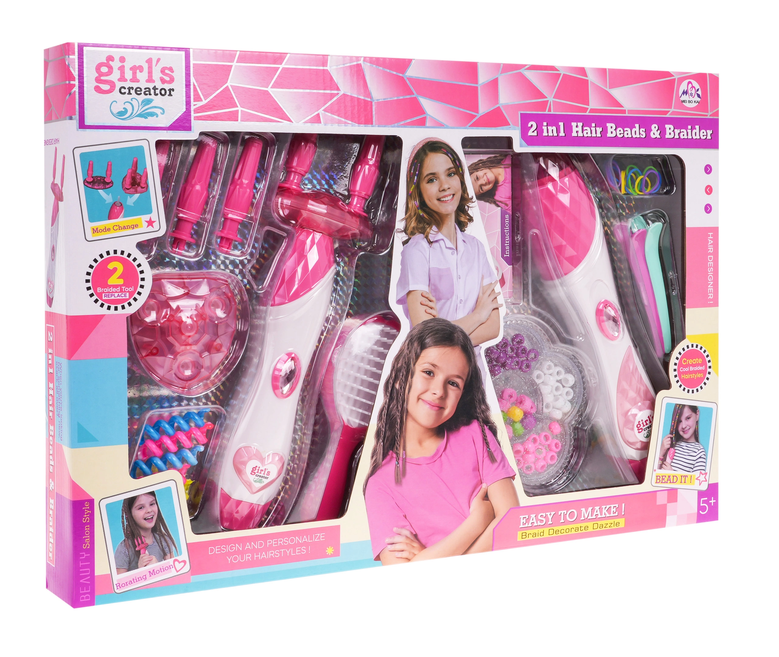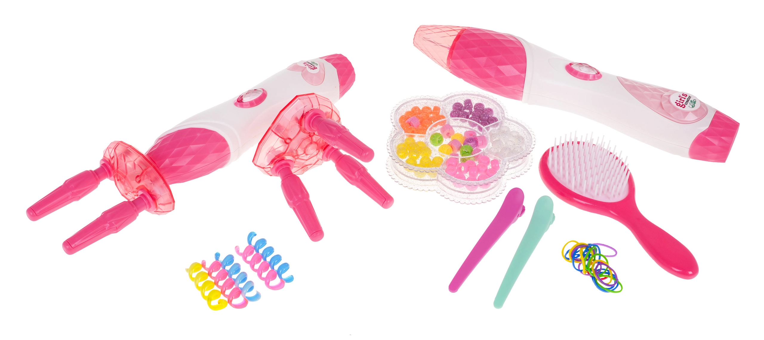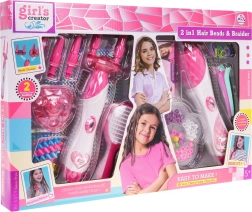 Αυτό το δημιουργικό σετ για μικρές κομμώτριες προσφέρει όσα χρειάζονται για γρήγορο πλέξιμο κοτσιδιών και πρωτότυπη διακόσμηση μαλλιών. Το μηχάνημα για κοτσιδάκια είναι εύκολο στη χρήση – απλώς τοποθετήστε τις τούφες και μετακινήστε τον διακόπτη. Ο εφαρμοστής χαντρών επιτρέπει την τοποθέτηση χρωματιστών χαντρών στα μαλλιά μέσα σε λίγες στιγμές. Χάρη στον πλούσιο εξοπλισμό, δημιουργούνται δεκάδες στυλ για κάθε περίσταση.