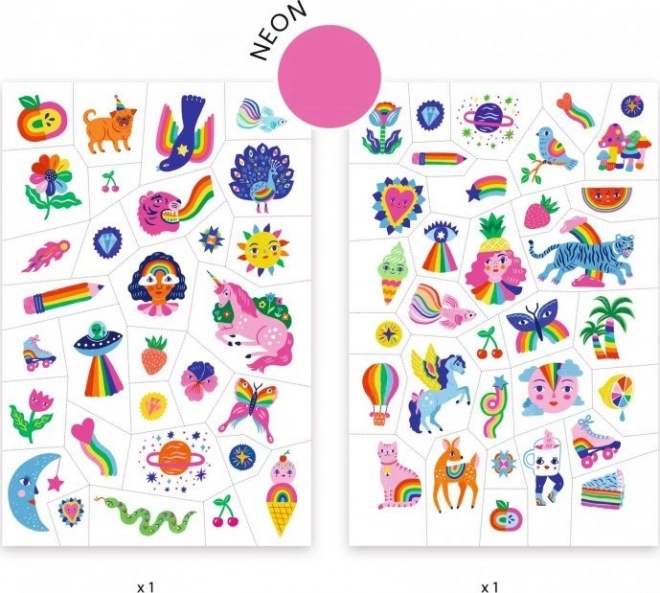 Το πακέτο προσωρινών τατουάζ DJECO Rainbow φέρνει ζωηρά χρώματα και κομψές, τρυφερές εικονογραφήσεις που τα παιδιά θα αγαπήσουν. Η εφαρμογή είναι αστραπιαία – απλώς κόψτε, αφαιρέστε το φιλμ και πιέστε· το τατουάζ μεταφέρεται άμεσα στο δέρμα χωρίς ανάγκη για νερό.