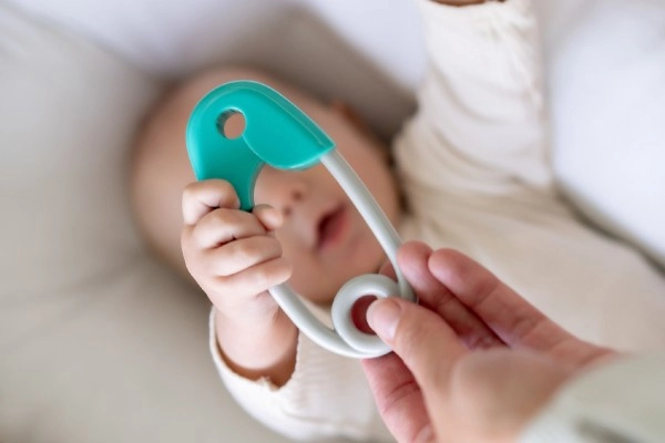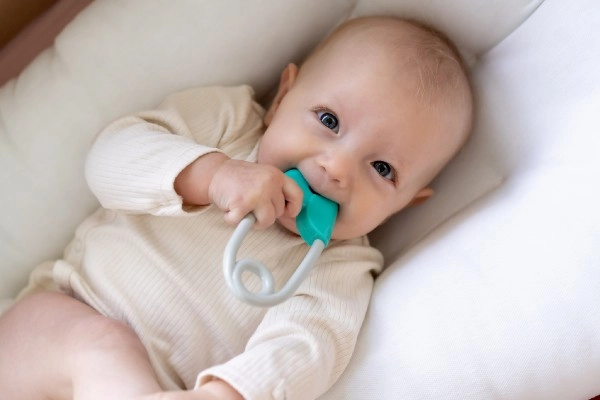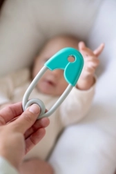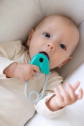 Η παιδική κουδουνίστρα-παραμάνα αποτελεί απαραίτητο κομμάτι της ανάπτυξης κάθε μωρού. Έχει σχεδιαστεί ώστε να εφαρμόζει τέλεια στα μικρά χεράκια, με τιρκουάζ-γκρι σχεδιασμό που διεγείρει την οπτική αντίληψη του παιδιού. Η κουδουνίστρα διαθέτει μικρές μπίλιες που κατά την κίνηση κουδουνίζουν απαλά, διατηρώντας το ενδιαφέρον του παιδιού και προάγοντας την ανάπτυξη της ακοής.