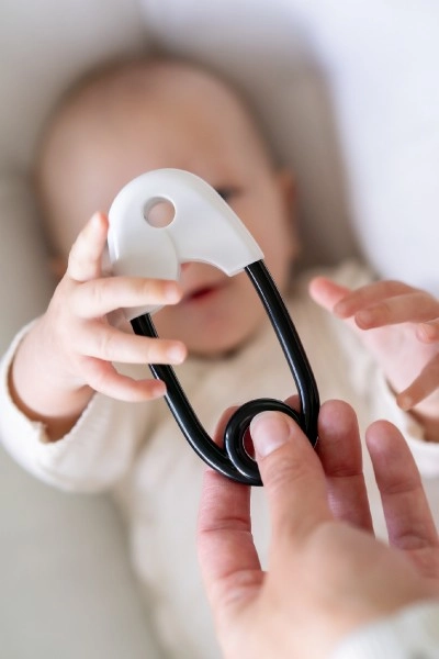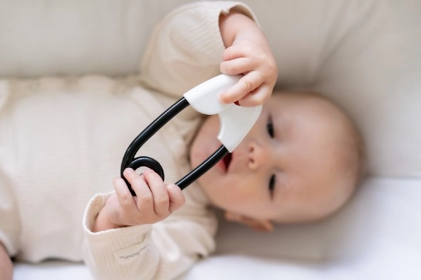 Η κουδουνίστρα σε σχήμα παραμάνας έχει σχεδιαστεί ώστε να υποστηρίζει τη λεπτή κινητικότητα και την αισθητηριακή αντίληψη των παιδιών από τη γέννηση. Χάρη στον αντιθετικό σχεδιασμό της τραβά την προσοχή του παιδιού, ενώ οι μικρές μπίλιες στο εσωτερικό προσφέρουν έναν απαλό κουδουνιστό ήχο.