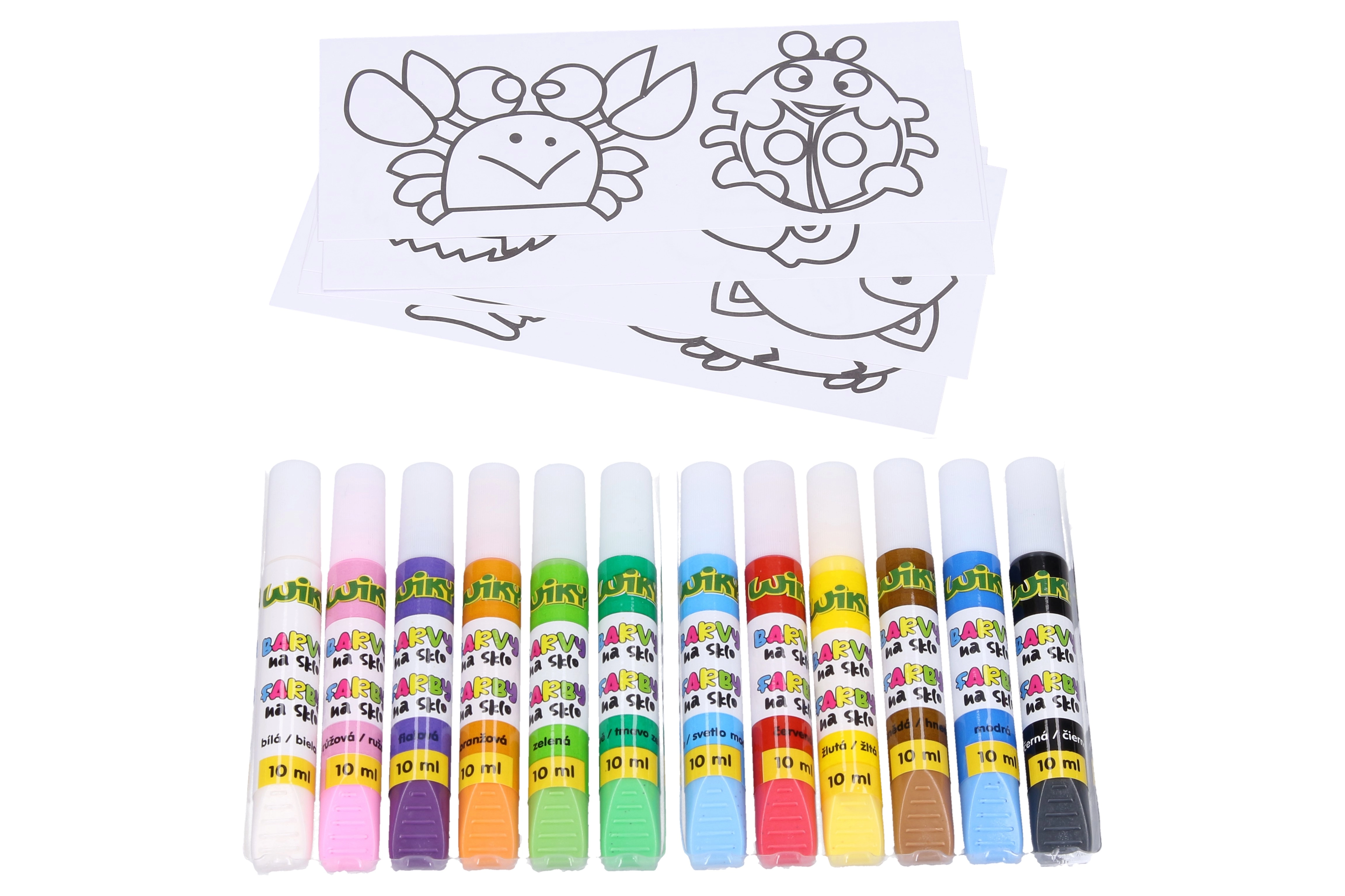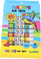 Σας παρουσιάζουμε ένα σετ χρωμάτων για γυαλί, ιδανικό για δημιουργική απασχόληση και διακόσμηση γυαλιού. Το σετ περιλαμβάνει 11 διαφορετικές χρωματικές αποχρώσεις: λευκό, ροζ, μωβ, πορτοκαλί, πράσινο, σκούρο πράσινο, γαλάζιο, κόκκινο, κίτρινο, καφέ και μπλε, καθεμία των 10 ml. Επιπλέον, στη συσκευασία θα βρείτε και μαύρο περίγραμμα 10 ml, ιδανικό για την ανάδειξη των σχεδίων σας.