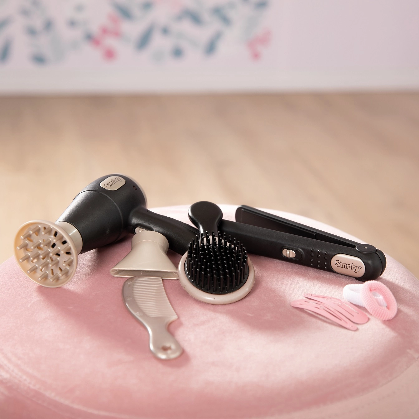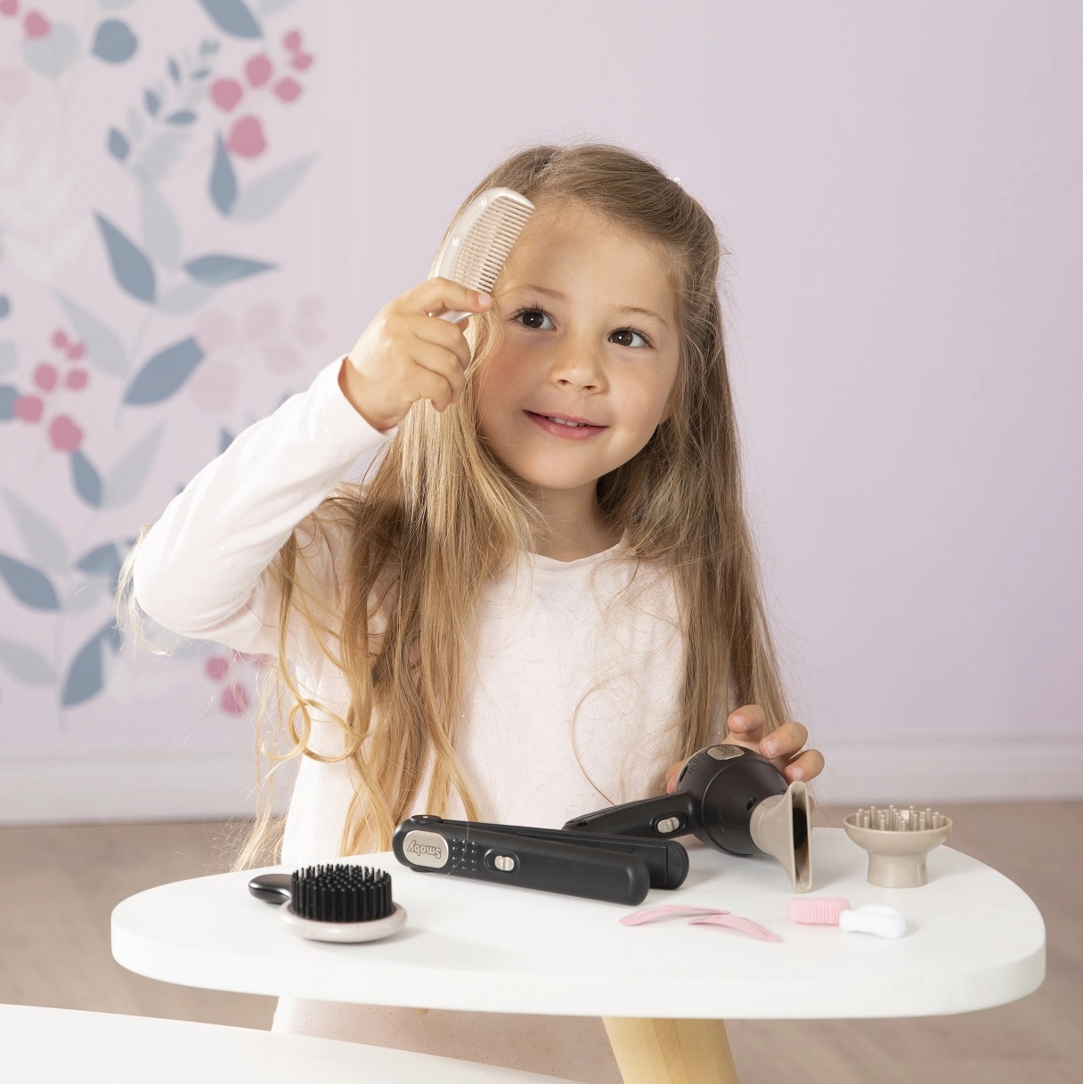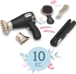 Εναλλάξιμα ακροφύσια για το σεσουάρ, ισιωτικό μαλλιών, βούρτσα, χτένα, κλιπ και λαστιχάκια – όλα για τη δημιουργία φανταστικών χτενισμάτων.