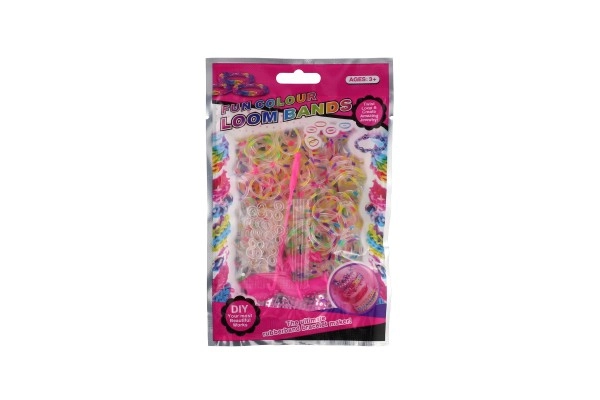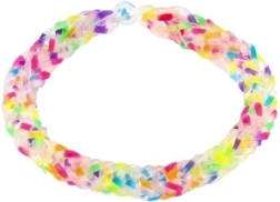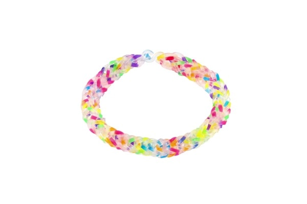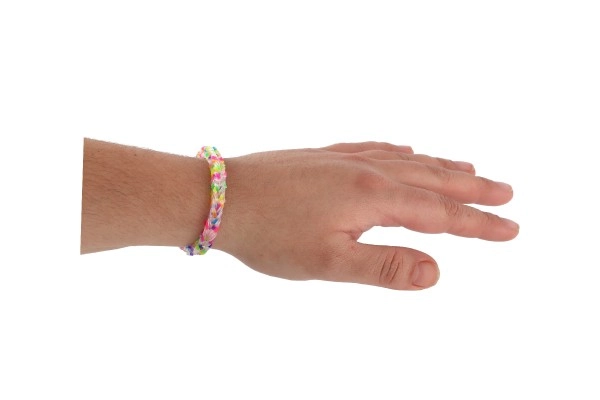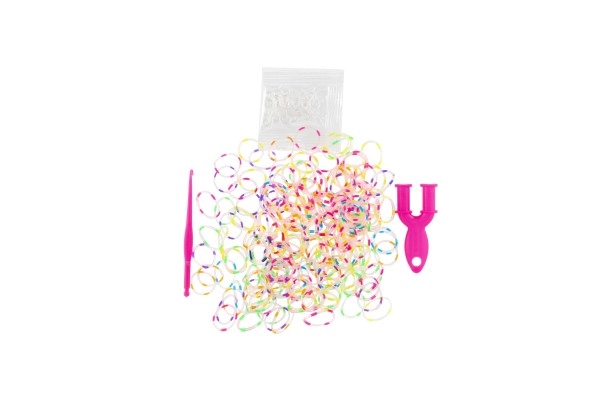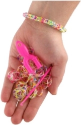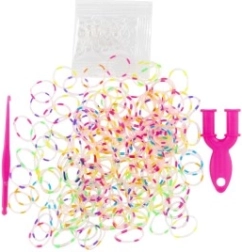 Περιλαμβάνει ό,τι χρειάζεται για την κατασκευή βραχιολιών - 200 λαστιχάκια ουράνιου τόξου, βελονάκι και κλεισίματα.