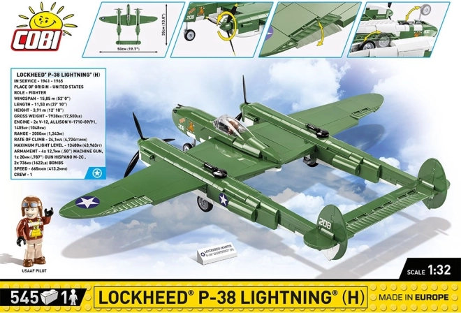 Συναρμολογήστε το θρυλικό αμερικανικό μαχητικό του Β΄ Παγκοσμίου Πολέμου – LOCKHEED P‑38 LIGHTNING σε κλίμακα 1:32 από την COBI. Το σετ περιλαμβάνει 545 κομμάτια, λεπτομερή εκτυπώματα χωρίς αυτοκόλλητα, κινούμενα μέρη (έλικες, πτερύγια, σύστημα προσγείωσης) και ανοιγόμενη καμπίνα με φιγούρα πιλότου. Η επίσημη άδεια LOCKHEED MARTIN εγγυάται πιστή αναπαράσταση του εμβληματικού «Ιπτάμενου Δίδυμου Δοκαριού».