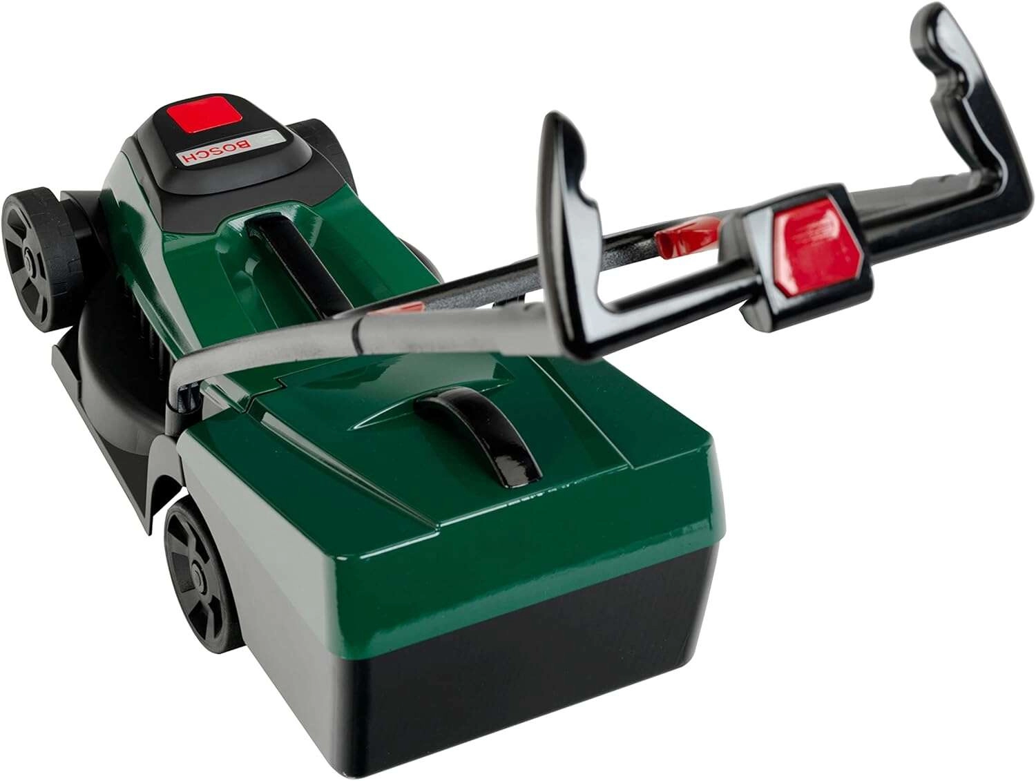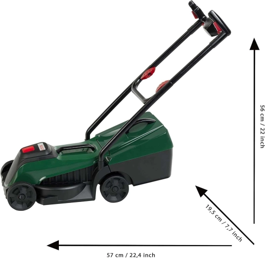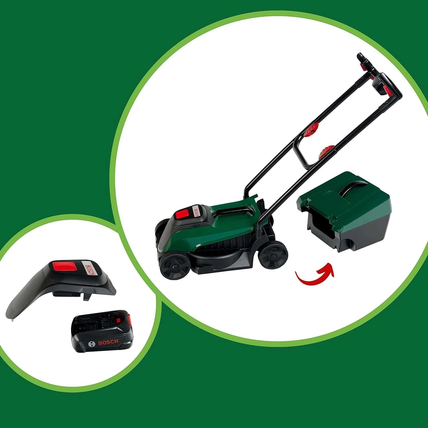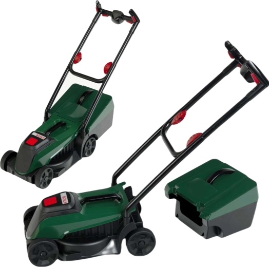 Αυτή η παιδική κουρευτική μηχανή μιμείται πιστά μια πραγματική συσκευή: έχει σκούρο πράσινο σώμα, μαύρη λαβή και κινητούς τροχούς που κυλούν ομαλά σε διάφορες επιφάνειες. Η ενσωματωμένη, αφαιρούμενη φωτεινή και ηχητική μονάδα ανάβει το λογότυπο BOSCH με το πάτημα ενός κουμπιού και αναπαράγει ρεαλιστικούς ήχους κινητήρα. Ακόμη και χωρίς τη μονάδα, κατά το σπρώξιμο ακούγεται ένα ευχάριστο μηχανικό «κλικ» και ρυθμικός βόμβος από τους τροχούς.