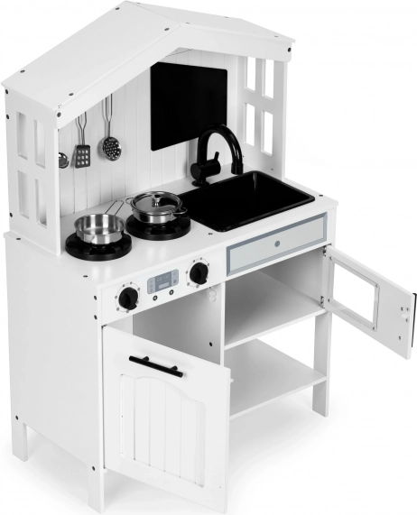 Η κουζίνα ECOTOYS διαθέτει πιστά επεξεργασμένες λεπτομέρειες που επιτρέπουν στα παιδιά να νιώθουν σαν σε πραγματική κουζίνα. Η χρωματική εμφάνιση και τα λειτουργικά στοιχεία προσκαλούν σε πολλές ώρες παιχνιδιού.