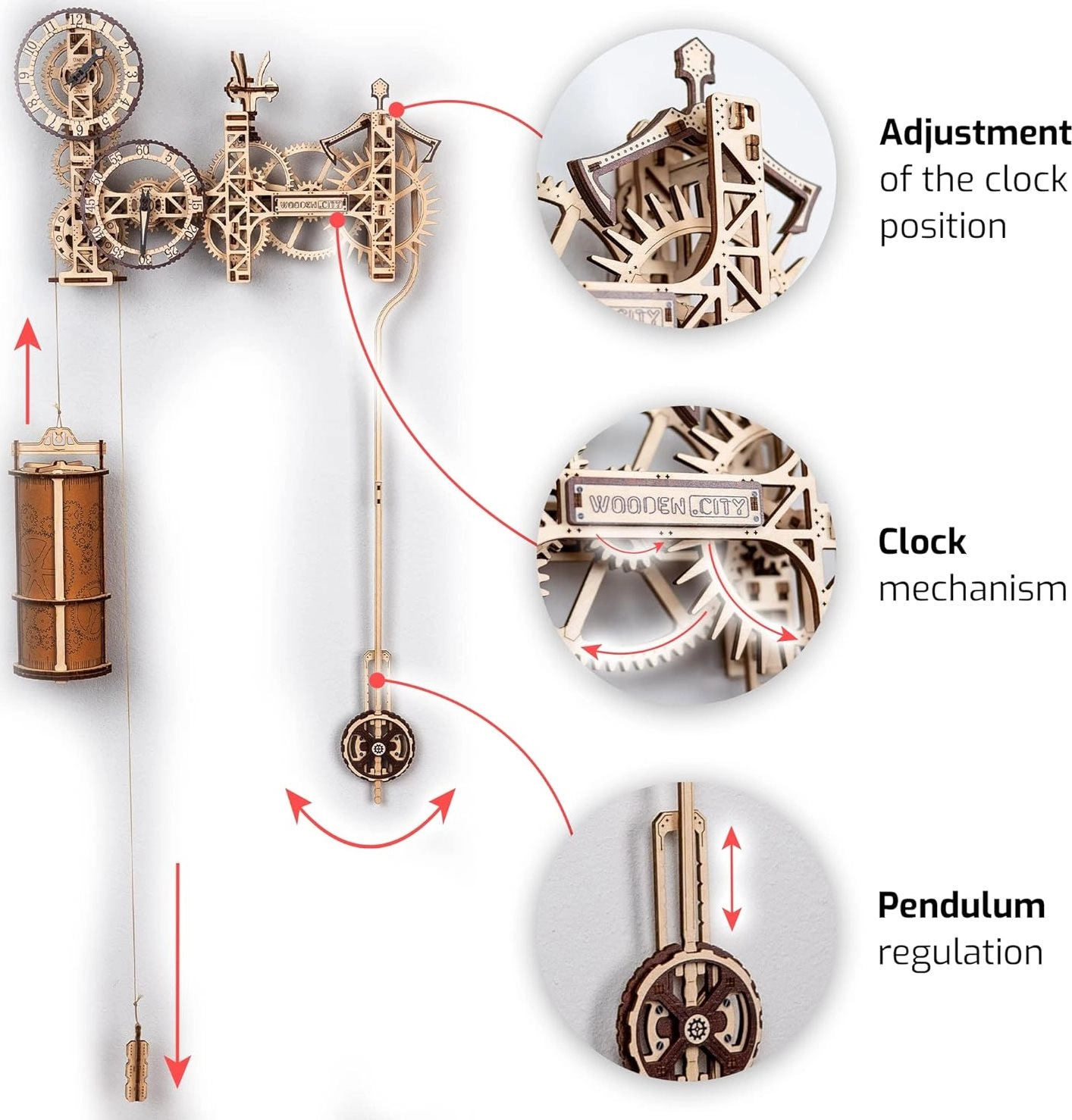 Χάρη στην έξυπνη κατασκευή, το μοντέλο συναρμολογείται χωρίς κόλλα, τα κομμάτια εφαρμόζουν με ακρίβεια και όλη η διαδικασία συνοδεύεται από εικονογραφημένο εγχειρίδιο. Το έργο αναπτύσσει δεξιότητες STEM και σας επιτρέπει να γνωρίσετε από κοντά τις αρχές των μεταδόσεων, των οδοντωτών τροχών και της μηχανικής των ρολογιών με εκκρεμές.
