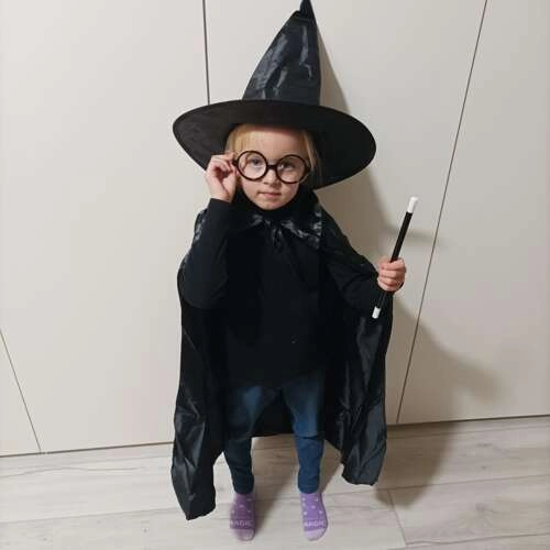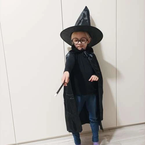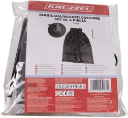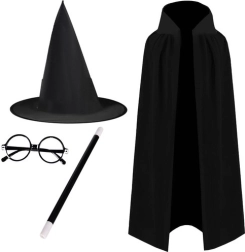 Πλήρες μαγικό κοστούμι για παιδιά που μεταμορφώνει σε στιγμές τον μικρό λάτρη της μαγείας σε μάγο. Το σετ περιλαμβάνει μακριά μαύρη κάπα με γιακά, ψηλό μυτερό καπέλο, στρογγυλά γυαλιά χωρίς φακούς και κλασικό μαγικό ραβδί. Ιδανικό για Halloween, αποκριάτικα πάρτι και σπιτικά μαγικά σόου.