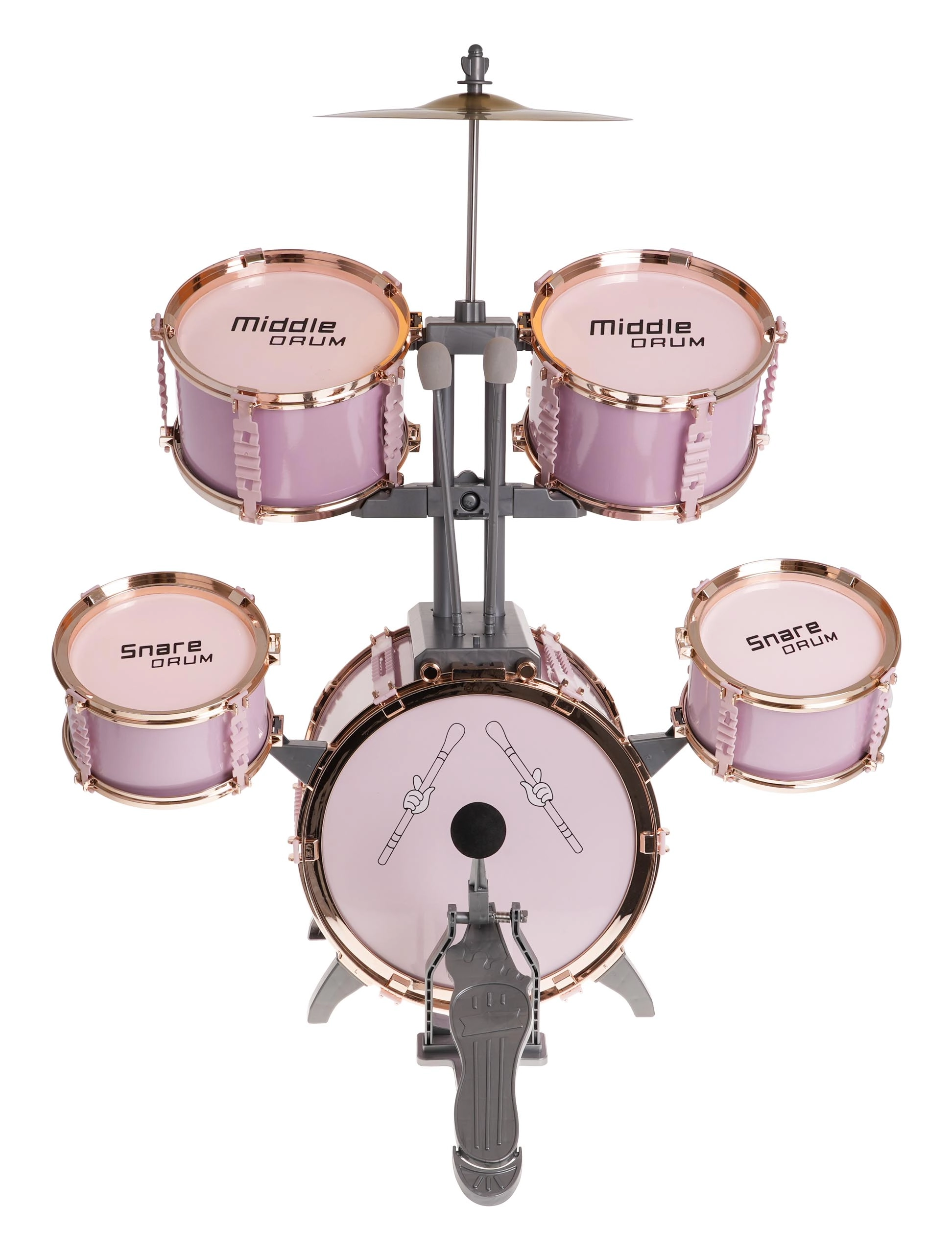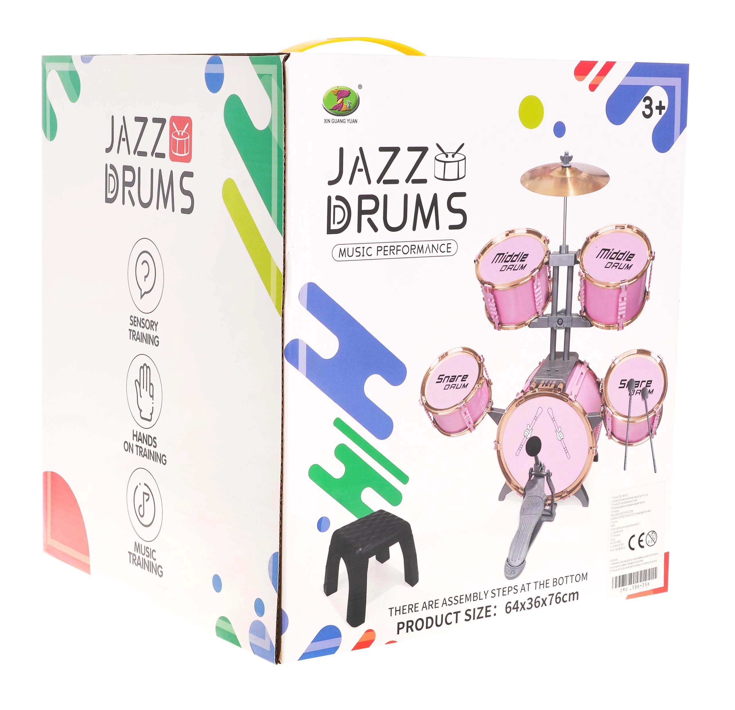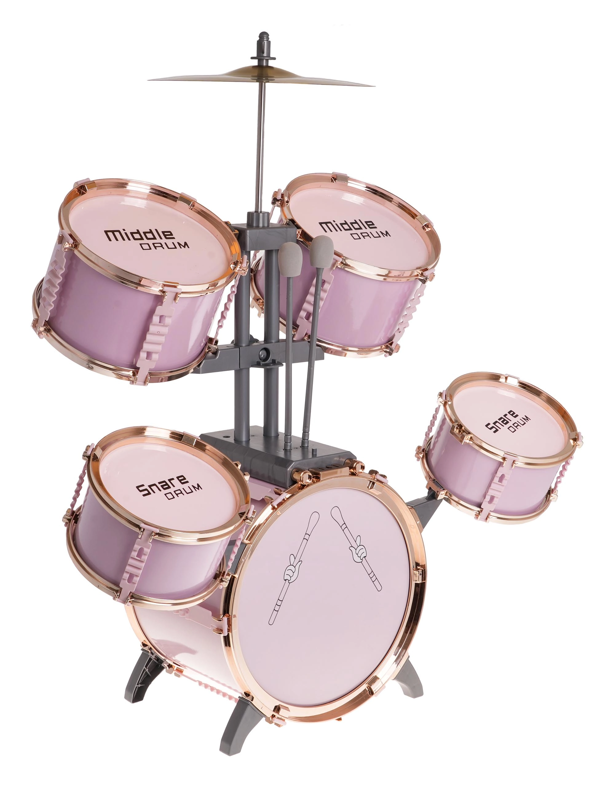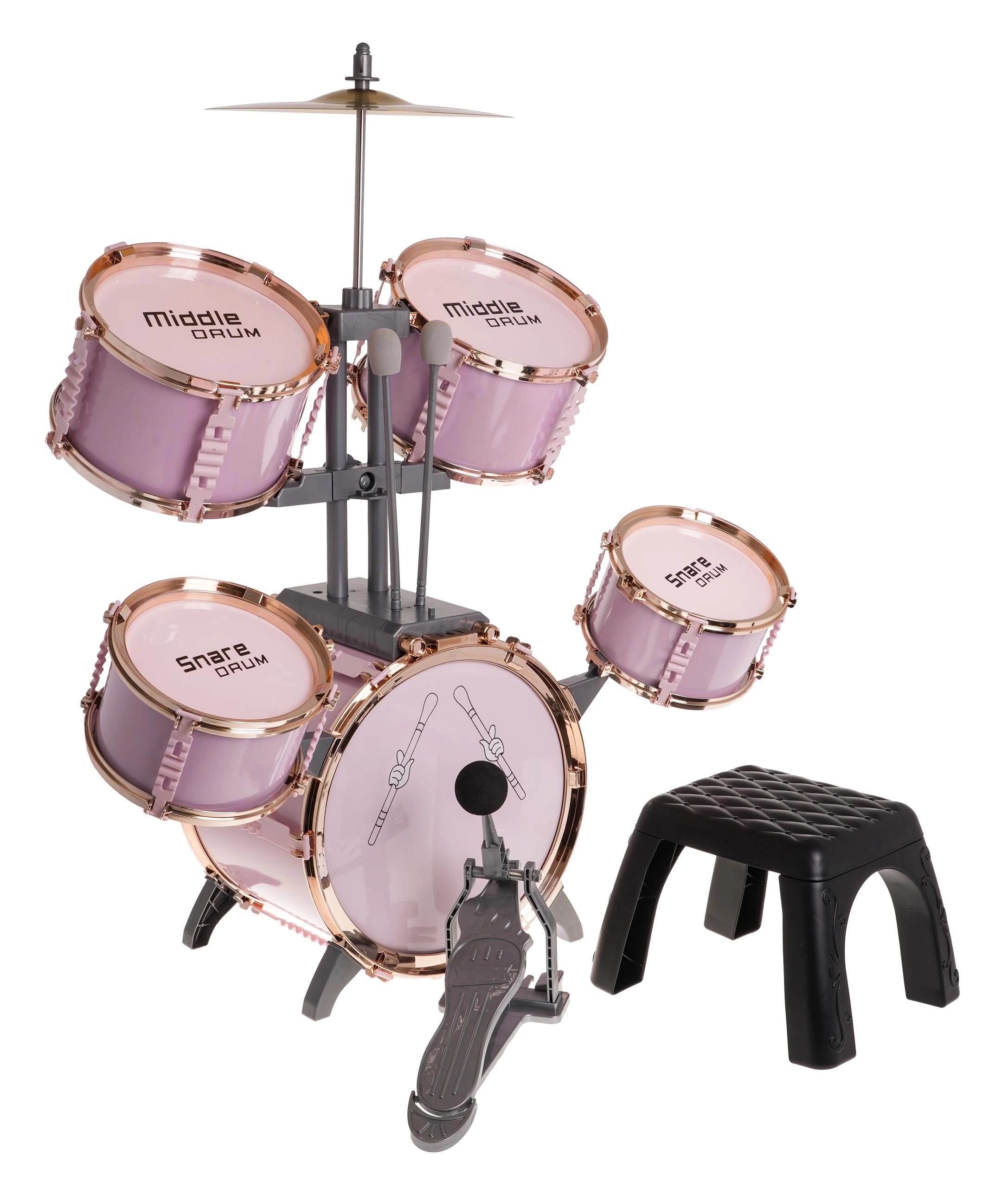 Ξεκινήστε τη συναυλία στο σπίτι με το ροζ παιδικό σετ ντραμς με 5 τύμπανα, μεταλλικό πιατίνι, πεντάλ για το μεγάλο τύμπανο, 2 μπαγκέτες και σκαμπό. Ιδανικό για παιδιά από 3 ετών – ενισχύει τον ρυθμό, τον συντονισμό και την δημιουργικότητα στο παίξιμο.