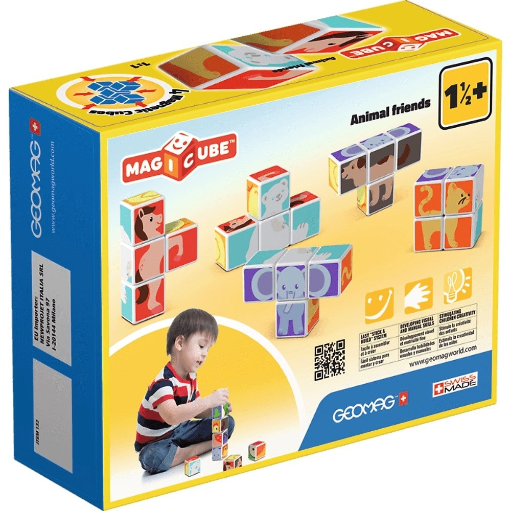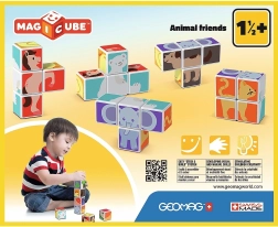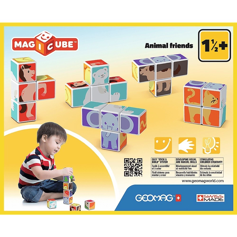 Ανακαλύψτε τη μαγεία της κατασκευής GEOMAG Magicube: τέσσερα μαγνητικά τουβλάκια με μοτίβα ζωάκια, που κολλούν εύκολα μεταξύ τους από όλες τις πλευρές. Τα παιδιά μπορούν να φτιάξουν ένα πολικό σκυλάκι, γατάκι, κοτούλα, αρκουδάκι, αλογάκι ή ελεφαντάκι, ή να δημιουργήσουν δικά τους σχήματα. Το σετ καλλιεργεί τη λεπτή κινητικότητα, τη λογική σκέψη, την συντονισμένη κίνηση και τη φαντασία και παρακινεί σε διήγηση ιστοριών. Περιλαμβάνονται 6 κάρτες έμπνευσης. Κατασκευάζεται στην Ελβετία.