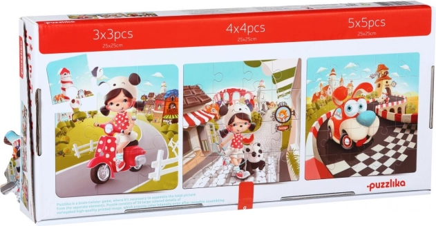 Puzzlika Χαρούμενες ιστορίες 3 σε 1 είναι ένα εξαιρετικό διασκεδαστικό παζλ σχεδιασμένο ειδικά για μικρά παιδιά. Κάθε σετ περιλαμβάνει 50 στιβαρά και ανθεκτικά κομμάτια, από τα οποία μπορούν να συναρμολογηθούν τρεις ξεχωριστές εικόνες διαστάσεων 25 x 25 εκ. Κάθε εικόνα έχει διαφορετικό αριθμό κομματιών: 3x3, 4x4 και 5x5. Η κατασκευή του παζλ χρησιμοποιεί ποιοτικό πολυστρωματικό χαρτόνι με γυαλιστερή επιφάνεια, από ξύλο οικολογικής καλλιέργειας. Το παζλ μπορεί να καθαριστεί εύκολα με ένα υγρό πανάκι.