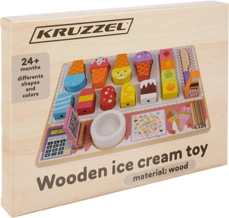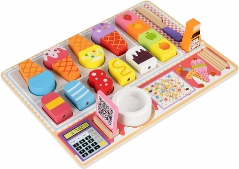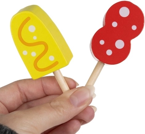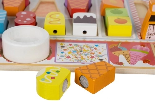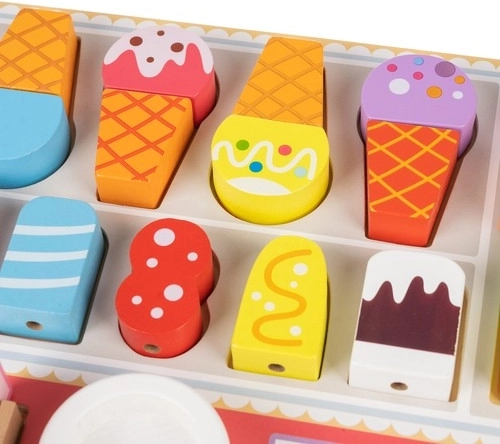 Αυτό το στιλάτο ξύλινο παγωτατζίδικο προσφέρει στα παιδιά αυθεντική ατμόσφαιρα μικρού ζαχαροπλαστείου. Χάρη στα ζωηρά χρώματα και τους πολλούς συνδυασμούς παγωτών, τα παιδιά μαθαίνουν να αναγνωρίζουν χρώματα, σχήματα και μεγέθη και αναπτύσσουν φυσικά γνωστικές και αισθητηριακές δεξιότητες. Τα ξύλινα στοιχεία εφαρμόζουν ευχάριστα στο μικρό χεράκι και υποστηρίζουν τον σωστό χειρισμό και την υπομονή κατά τη στοίβαξη μπαλών και γρανιτών.