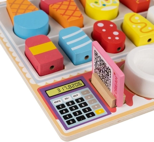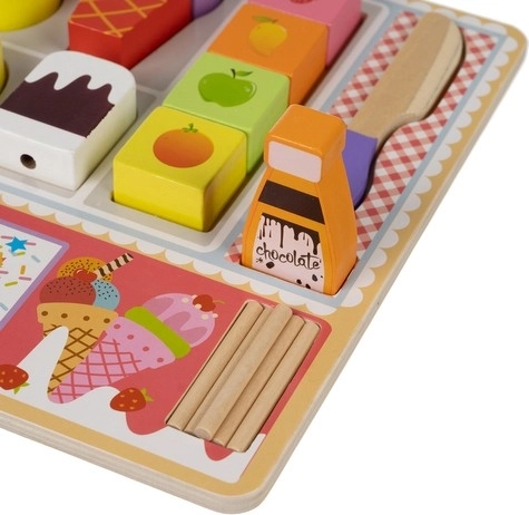 Κώνοι, μπάλες παγωτού, γρανίτες, μπολάκι, «σοκολάτα», δίσκος και πινακάκι – όλα για απεριόριστους συνδυασμούς και εκμάθηση σχημάτων και χρωμάτων.