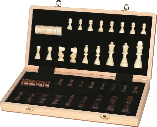 Πρακτική ξύλινη σκακιέρα που διπλώνει σε ένα συμπαγές βαλιτσάκι με κλιπ· στο εσωτερικό αποθηκεύετε με ασφάλεια όλα τα πιόνια.