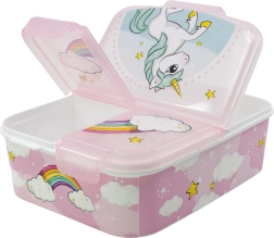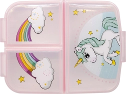 Στυλάτο multi box για κολατσιό με χαρούμενο θέμα μονόκερου και ουράνιου τόξου βοηθά τα παιδιά να κρατούν το φαγητό τακτοποιημένο και φρέσκο. Οι τρεις ξεχωριστές θήκες είναι ιδανικές για φρούτα και λαχανικά, σάντουιτς και μικρές λιχουδιές. Η στιβαρή κατασκευή αντέχει σε συνηθισμένες πτώσεις και χτυπήματα, κάνοντάς το εξαιρετική επιλογή για καθημερινή χρήση.