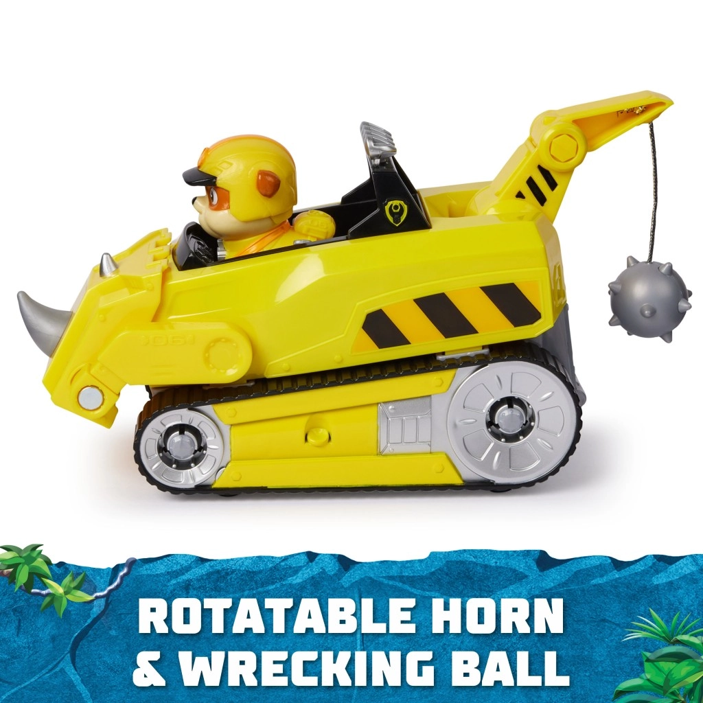Ο αγαπημένος σύντροφος Rubble έρχεται με ένα στιβαρό όχημα που προσφέρει εντυπωσιακή μεταμόρφωση σε λειτουργία διάσωσης. Πατήστε το σήμα της Paw Patrol στο καπό για να περιστρέψετε αμέσως τη λεπίδα του εκσκαφέα, η οποία αποκαλύπτει κέρας ρινόκερου. Ανοίξτε το πίσω διαμέρισμα, σηκώστε τον βραχίονα του γερανού και χρησιμοποιήστε τη μπάλα κατεδάφισης για να απομακρύνετε κάθε εμπόδιο.