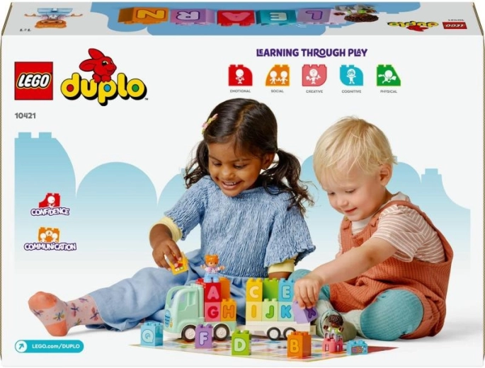 Το σετ LEGO DUPLO Φορτηγό με το αλφάβητο προσφέρει στα παιδιά έναν διασκεδαστικό τρόπο γνωριμίας με τα γράμματα. Χάρη στα μεγάλα και εύκολα στο κράτημα κομμάτια, τα μικρά παιδιά μαθαίνουν χρώματα, γράμματα και απλή σύνθεση λέξεων ενώ εξασκούν τον συντονισμό ματιού–χεριού. Το κινούμενο φορτηγό με αποσπώμενο τρέιλερ και δύο φιγούρες προσκαλεί σε ανοιχτό παιχνίδι ρόλων.