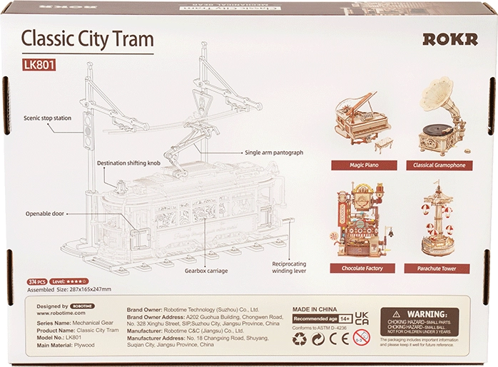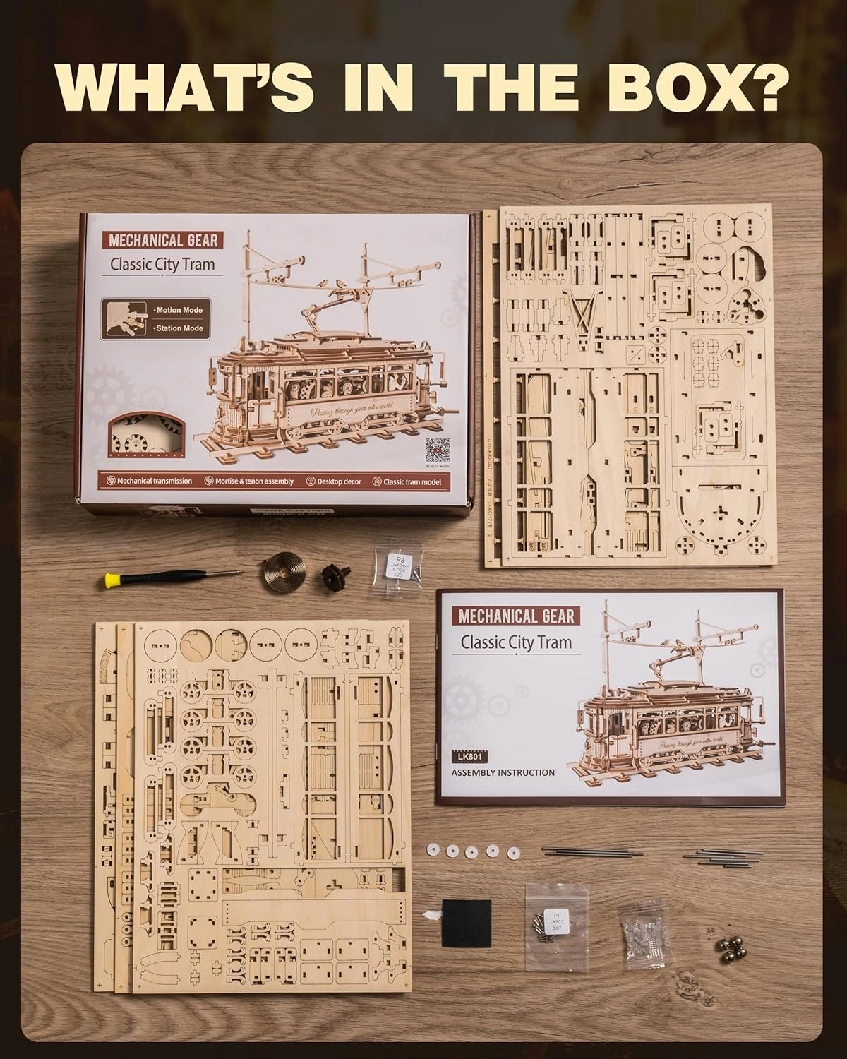Ετοιμαστείτε για μια μοναδική εμπειρία κατά την κατασκευή του ξύλινου τραμ μας, που θυμίζει τα πρώτα αστικά τραμ του 19ου αιώνα. Το μοντέλο έχει σχεδιαστεί προσεκτικά ώστε να αποδίδει τη γοητεία της ιστορίας και την τεχνική πολυπλοκότητα, ιδανικό τόσο για διακοσμητική όσο και για εκπαιδευτική χρήση.