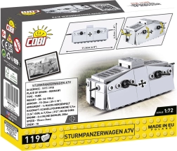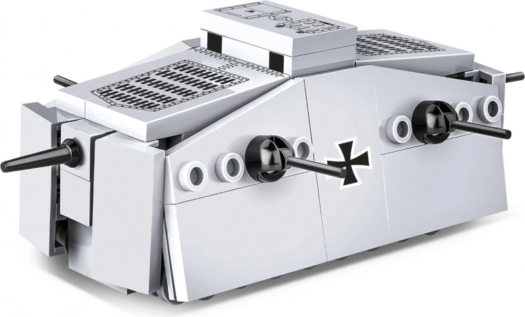 Το Sturmpanzerwagen A7V ήταν το πρώτο γερμανικό άρμα που αναπτύχθηκε προς το τέλος του Α΄ Παγκοσμίου Πολέμου. Αυτό το εμβληματικό τεθωρακισμένο, με πλήρωμα έως και 18 στρατιωτών, έφερε κανόνι Nordfeld 57mm και έξι πολυβόλα MG 08. Το μοντέλο της COBI σε κλίμακα 1:72 με μήκος περίπου 11,5 cm διατηρεί τα τυπικά χαρακτηριστικά του πρωτοτύπου και εντυπωσιάζει με ακριβείς εκτυπώσεις σταυρών, γριλιών και θυρίδων.