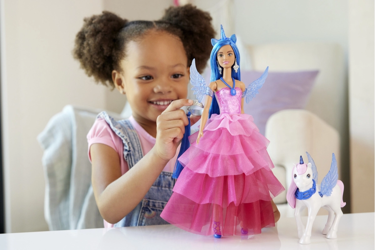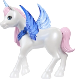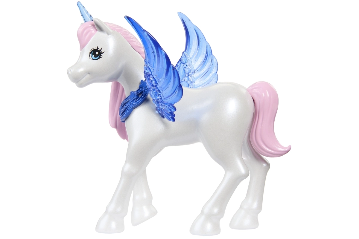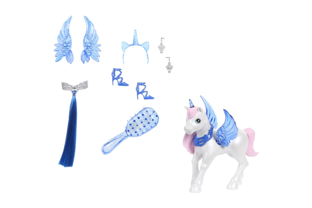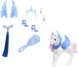 Φτιάξτε τις δικές σας παραμυθένιες ιστορίες: προσθέστε τα μπλε αφαιρούμενα φτερά, φορέστε το στεφάνι με κέρας μονόκερου και ολοκληρώστε το look με την ουρά του αλικορνίου. Συνοδοιπόρος είναι ένας χαριτωμένος μονόκερος με διάφανα φτερά, που εμπλουτίζει το παιχνίδι με ακόμη περισσότερες μαγικές στιγμές.