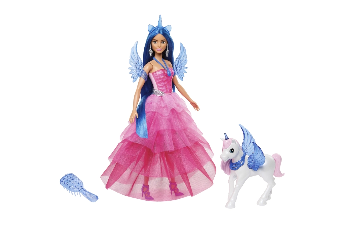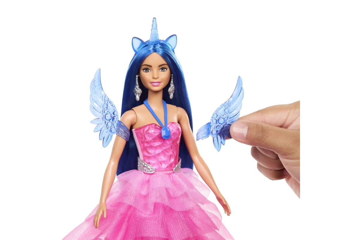 Στεφάνι με κέρας μονόκερου, μπλε φτερά και κουμπωτή ουρά επιτρέπουν αλλαγές στο στιλ στη στιγμή. Τα μαλλιά χτενίζονται εύκολα με την περιλαμβανόμενη βούρτσα.