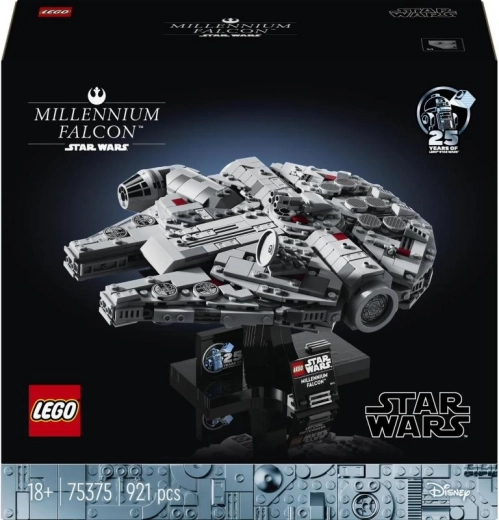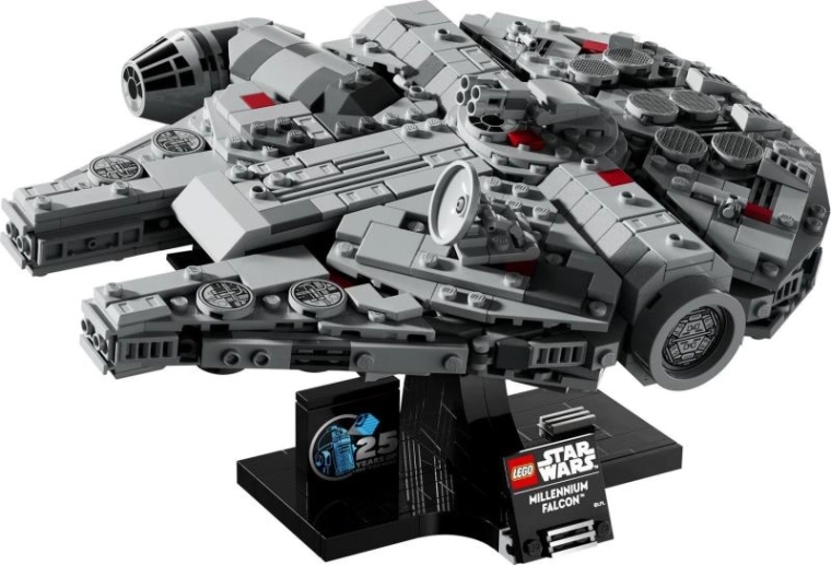 Η σταθερή βάση παρουσιάζει το Χιλιετές Γεράκι σε πτήση και συνοδεύεται από έντυπη πινακίδα και τουβλάκι για την 25η επέτειο του LEGO Star Wars.