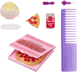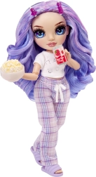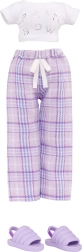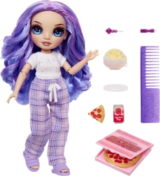Η Violet φοράει άνετες μοβ καρό πιτζάμες, απαλές παντόφλες και ένα σετ κερασμάτων – πίτσα, ποπ κόρν, πιάτο και ρόφημα. Ιδανικό για θεματικές σκηνές και πιτζαμο-πάρτι.