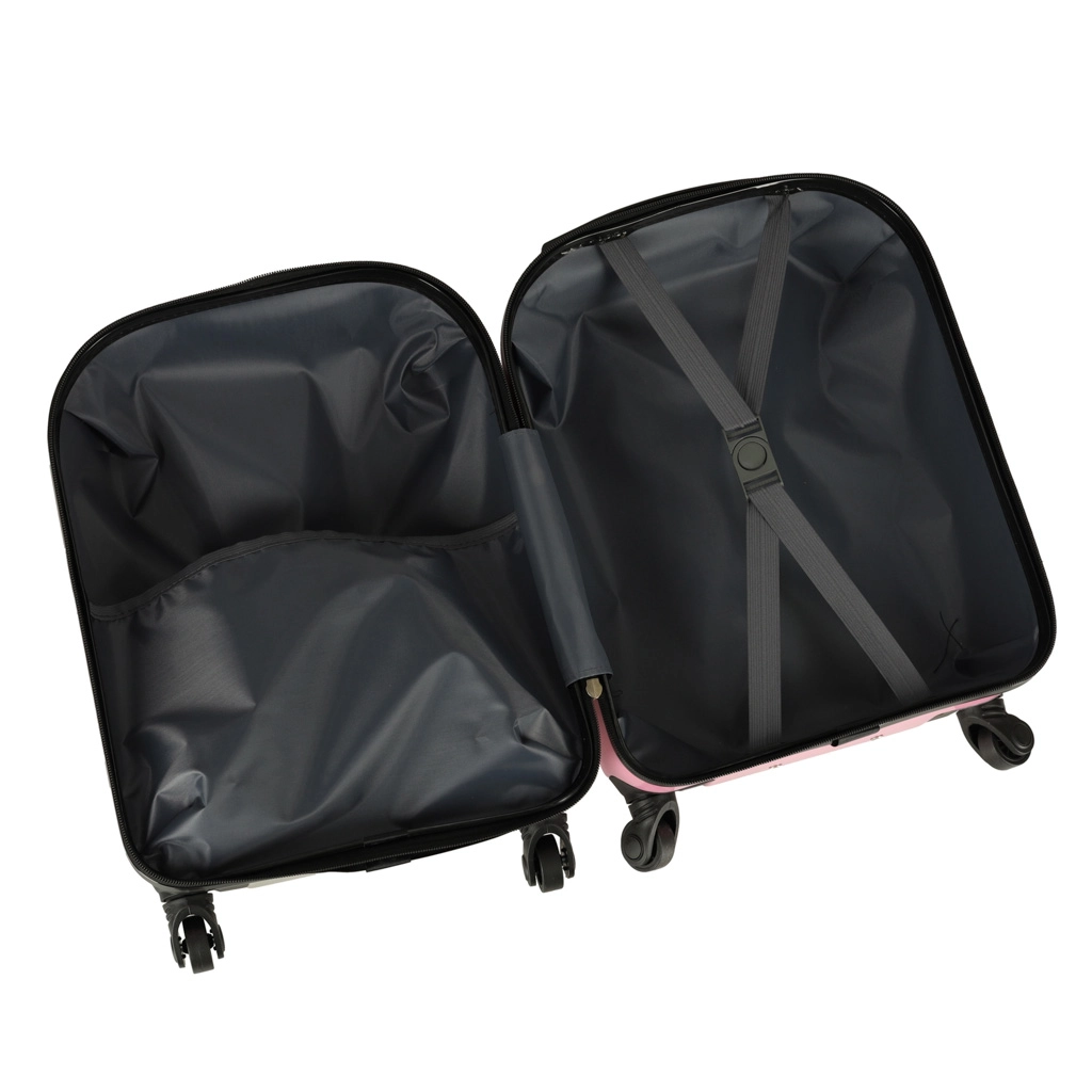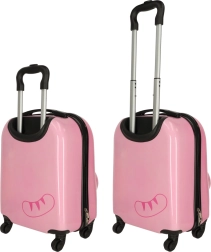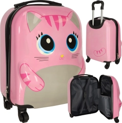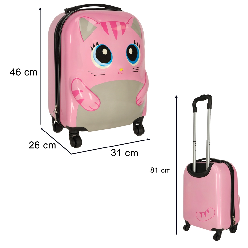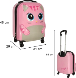 Χαριτωμένη παιδική βαλίτσα με μοτίβο γάτας σε ροζ χρώμα που μετατρέπει κάθε ταξίδι σε διασκέδαση. Χάρη στα τέσσερα ροδάκια και την τηλεσκοπική λαβή, χειρίζεται εύκολα, έχει μεγάλη χωρητικότητα και πρακτική εσωτερική διάταξη με δύο θαλάμους για τακτοποιημένη αποθήκευση ρούχων και παιχνιδιών. Ο ανθεκτικός σκληρός πλαστικός σχεδιασμός εξασφαλίζει χαμηλό βάρος και μεγάλη αντοχή.