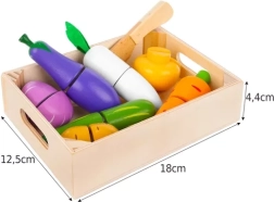 Αυτό το ξύλινο σετ λαχανικών σε συμπαγές καλαθάκι είναι ιδανικό για παιχνίδι μαγειρικής, μαγαζιού ή σπιτιού. Τα παιδιά μπορούν να «κόβουν» με το ασφαλές ξύλινο μαχαιράκι τα λαχανικά που ενώνονται με βέλκρο και στη συνέχεια να τα επανασυνδέουν. Τα ρεαλιστικά σχήματα και τα ζωηρά χρώματα προσκαλούν φυσικά στο παιχνίδι και καλλιεργούν τη φαντασία.