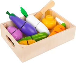 Διασκεδαστικό ξύλινο σετ λαχανικών για κοπή σε κομψό καλαθάκι που προσφέρει στα παιδιά ώρες δημιουργικού παιχνιδιού. Χάρη στα εσωτερικά κομμάτια βέλκρο, τα μεμονωμένα τεμάχια μπορούν εύκολα να «κοπούν» και να ενωθούν ξανά με το ασφαλές ξυλάκι-μαχαιράκι. Υποστηρίζει τη λεπτή κινητικότητα, τη δημιουργικότητα και την εκμάθηση χρωμάτων και σχημάτων, είναι ανθεκτικό και εύκολα μεταφερόμενο.