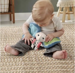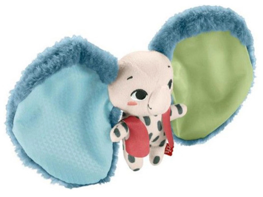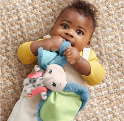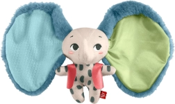Το αισθητηριακό, αγκαλίτσικο παιχνίδι σε σχήμα μικρού ελέφαντα προσφέρει πλούσια απτικά ερεθίσματα: απαλό βελούδινο ύφασμα, σατέν λεπτομέρειες και θροΐζοντα στοιχεία. Οι αντιθετικές αποχρώσεις του μπλε και του πράσινου τραβούν την προσοχή και υποστηρίζουν την ανάπτυξη της όρασης, ενώ τα εύκολα στο πιάσιμο σχήματα βοηθούν στην άσκηση της λεπτής κινητικότητας και του συντονισμού χέρι‑μάτι.