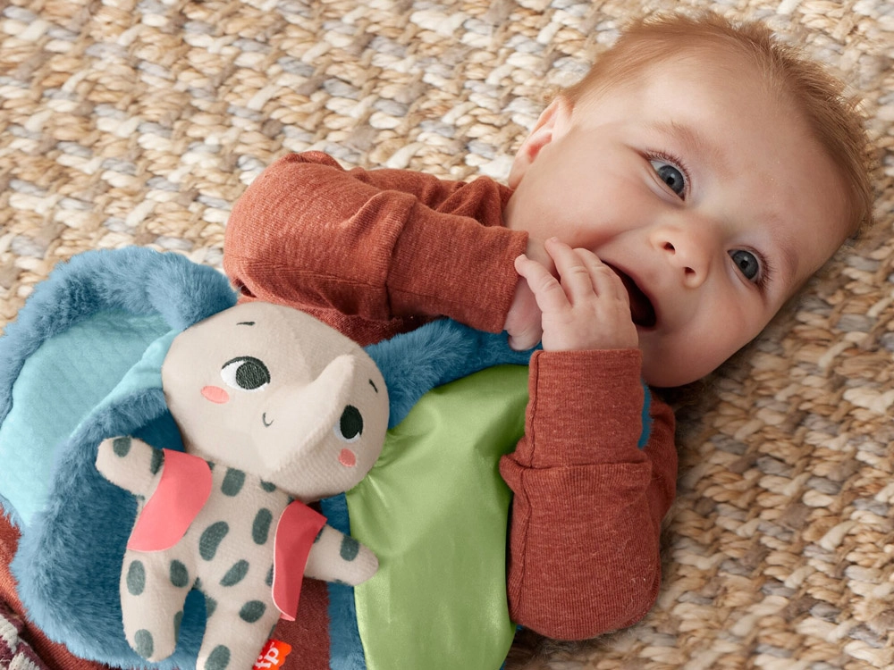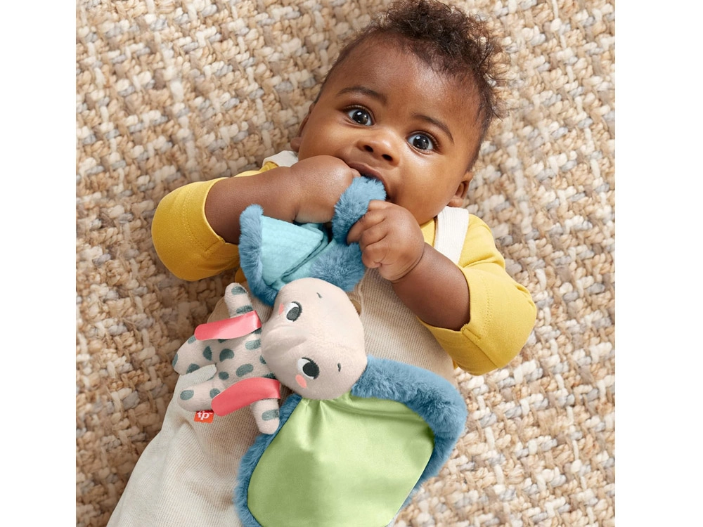 - Πολλαπλές υφές – απαλό βελούδο, σατέν στοιχεία και θροΐζουσες λεπτομέρειες για αισθητηριακή ανάπτυξη.